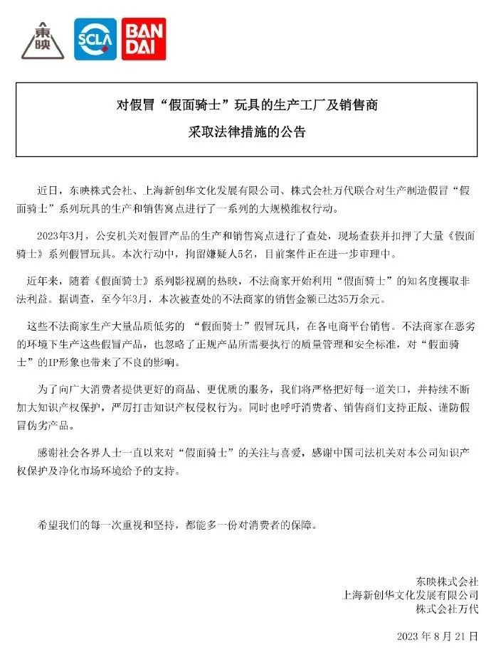 8月21日,BANDAI英雄天地【万代南梦宫(上海)娱乐有限公司广州分公司】官方微博发布官方【重要公告】,称东映株式会社、上海新创华文化发展有限公司、株式会社万代近日联合对生产制造假冒“假面骑士”系列玩具的生产和销售窝点进行了一系列的大规模维权行动。