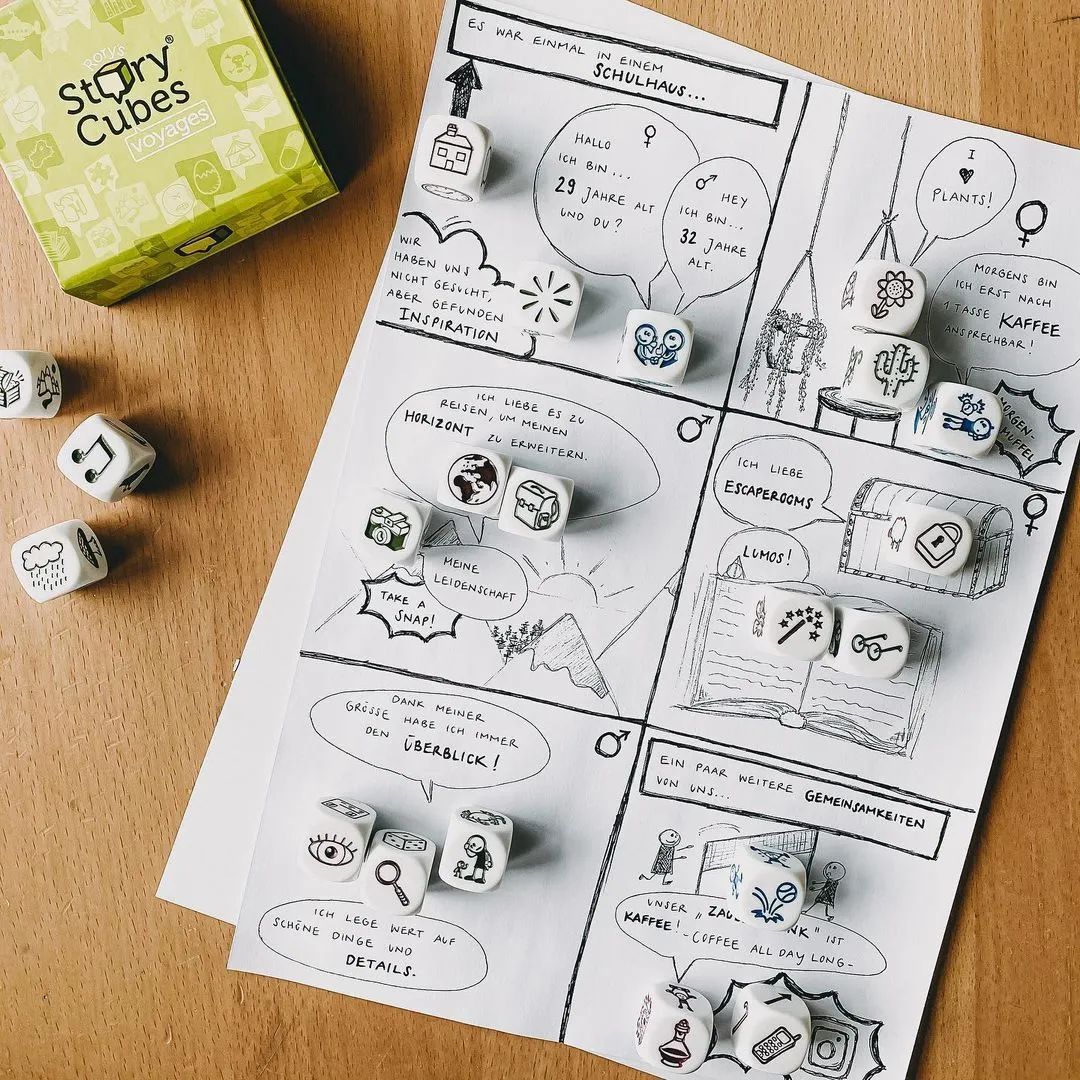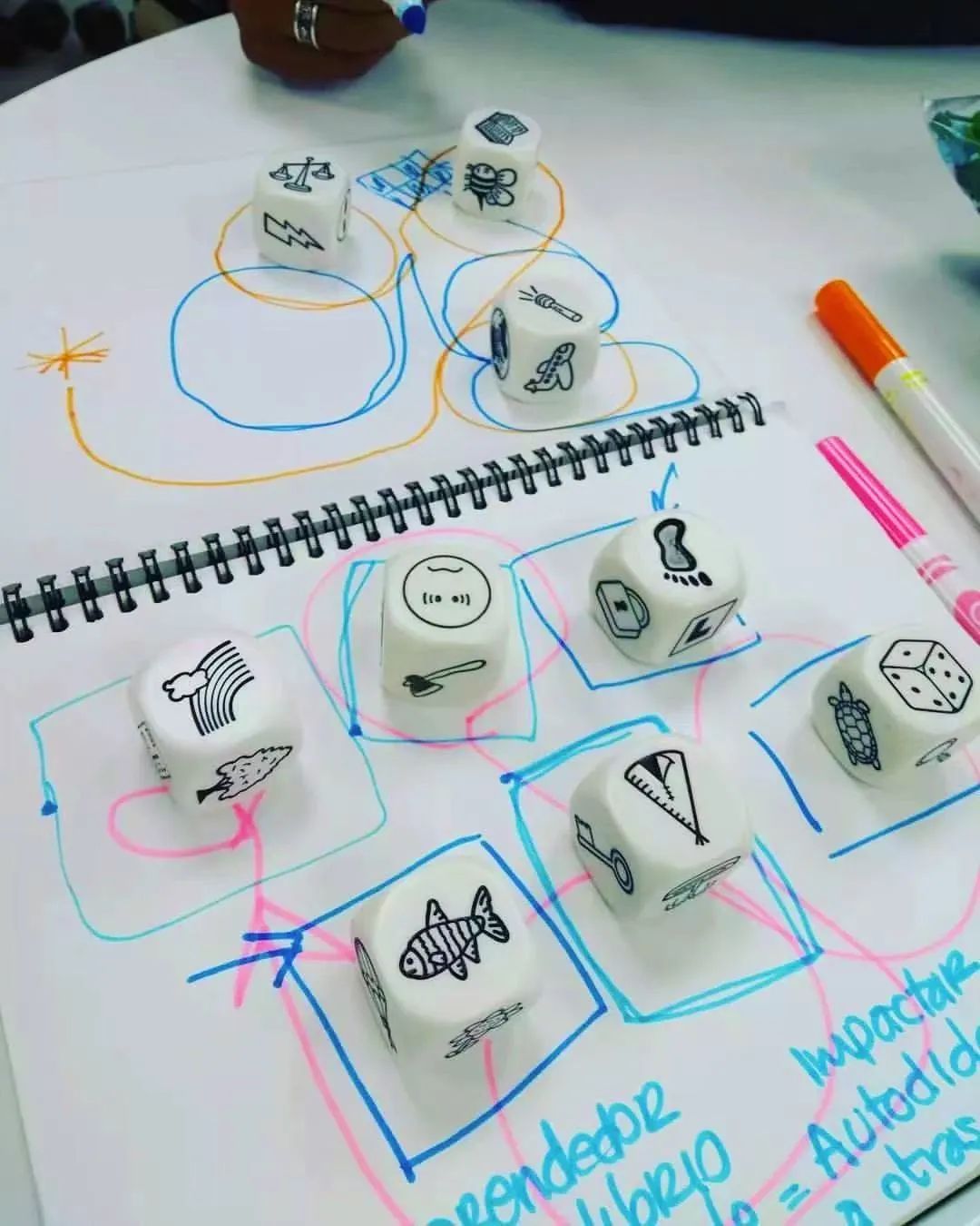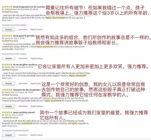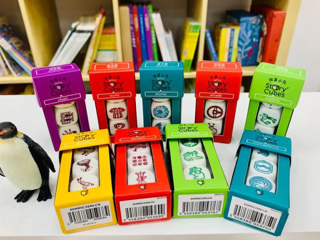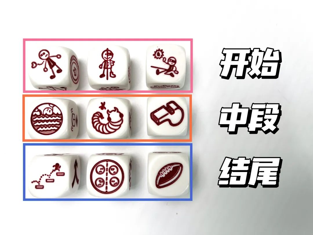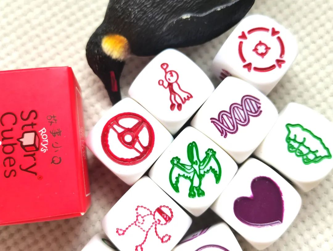 按9颗骰子来算,总共54个图像,排列组合就超过10000000种▼?一个超能力是穿越墙壁的坏人+超级赛亚人变身+超人正在拯救地球的路上还可以有无数种可能性......一步一步启发孩子发挥想象力、更加自如地应用词汇、组织语言、表达自我可以分别作为故事的开始、中段、结尾,每人以“很久很久以前......”来开始讲故事。这样孩子们讲述的故事结构会比较完整,而且这样的思路对于将来他们小学作文有帮助,我们建议学前班和小学一、二年级的孩子玩这款桌游,最好分三段来讲故事▼当然,我们也可以跟孩子玩故事接龙,共同讲一个故事,非常欢乐▼“脑洞大开”是这款游戏的魅力,因为没有标准答案,图案也是随机扔的,每次的故事几乎不会重复,孩子们尽管发挥他们的脑洞,玩“创意联想”、“故事接龙”、“即兴造句”都行。