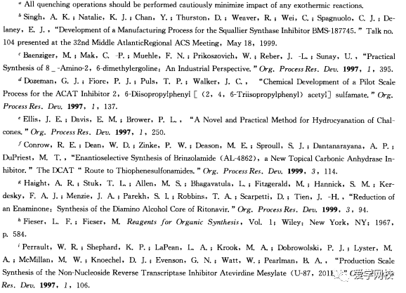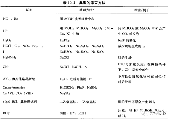 提示:把反应液转移到淬灭试剂溶液中的速度在减少副产物形成上可能具有重要的意义,通过直径较大的器皿转移效果比较好,通过加压可能比用泵抽的转移速度快。当反应对温度,pH以及时间比较敏感时,对这些因素的考虑就很重要。利用连续流动的反应器可以最大程度地控制淬灭反应的速率。