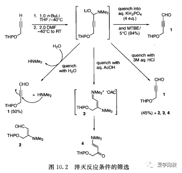 为了提高反应收率,也可以将反应混合物加入到淬灭试剂的溶液中。当淬灭反应,产生的副产物特别活泼,就应利用这种“逆淬灭”。如将淬灭试剂的水溶液加人到炔醛前体(图10.2)中时,产生的二甲胺会与目标产物1[2]发生反应。当把反应混合物加入到KH2PO4,水溶液中时,产生的二甲胺会迅速地被过量的酸中和,从而可以减少副产物2~4的形成。对于这种及类似的反应还可以采取另一种方法,即使用能很好控制反应液与淬灭试剂溶液流速的反应器(第13章)。