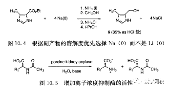 通常,中和反应体系有多种选择,首要考虑的可能是中和过程中生成盐的溶解性。选定的无机盐的溶解度列于表10.3。例如,对于NaOH参与的酯的水解反应可以用很多种酸来淬灭,相应的酸的钠盐就会生成。如果使用0. 5mol当量的浓H2SO4,来淬灭反应,那么大部分副产物Na2SO4,预计会沉淀或者结晶析出,由于其在水中具有相对较低的溶解度。如果在淬灭后反应产物在水中是可溶的,通过抽滤除Na2SO4,这样就减少了无机杂质带来的负担,并且利于产品的分离。然而,如果后续操作中包括用有机溶剂萃取,用浓H2SO,来淬灭反应可能会产生三相混合物(液相、液相、固相)和不必要的复杂操作,在这种情况下,选择一种生成的副产物具有很好的水溶性的酸就显得很重要了。类似的,如果产物在酸性条件下会结晶析出,使用浓HCI就比浓H2SO4,好,因为NaCl的水溶性比Na2SO4好,并且NaCl夹在产品晶体中的可能性更小。更多信息可以从表10.3获得,表中列出的有机酸(醋酸、苯甲酸、柠檬酸和草酸),等物质的量的钠盐比相应的锂盐和钾盐在水中的溶解性差。锂盐在醇中的溶解度比相应的钠盐和钾盐高,因此比碱金属盐更容易被带到有机萃取液中,除去锂盐就成了负担。由于锂盐被公认为是一种精神刺激性试剂,所以在原料药中需要被控制在相对较低的量。在用可溶性金属还原制备西眯替丁中间体的反应中,水溶性的产物6是通过用异丙醇提取来分离的,该反应选择Na (0)而不是Li (0),是因为通过锂(0) 还原生成的产物6中会含有较高含量的无机盐(图10. 4)[4]。离子强度会.影响酶的活性[5],因此可以利用后处理带来的锂盐来抑制酶的活性(图10.5)。从优化反应后处理和纯化产品的角度出发,反应时会优先选择生成钠盐或者钾盐的试剂,而不是生成锂盐的试剂。