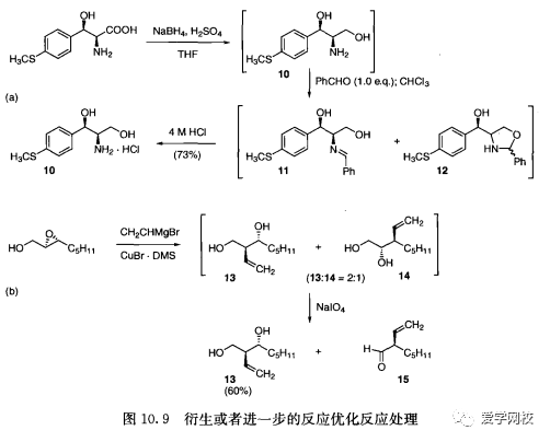 可能会对中间体做一定衍生, 以便于处理。极性官能团通常会被衍生或者转化成极性较低的官能团来萃取,水溶性的氨基二醇10与苯甲醛反应,生产亚胺11和唑啉12(图10.9 (a)) 更易萃取到有机溶剂中[25]。脱去保护重新生产10,醛和酮与亚硫酸氢钠混合生成水溶性的加成物有利于纯化产物1,3-二醇13,少量的杂质二醇14用高碘酸钠氧化成醛15 (图10.9 (b))。衍生和脱保护都需要花费时间来优化反应,如果衍生需要花费大量的时间,那么首先要对衍生的价值进行评估。
