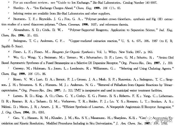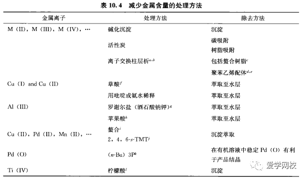 随着越来越多的使用金属催化,除去原料药中的金属具有重要意义。--些合成方法被重新设计,因为保持金属残留浓度在终产物中低于20ppm很困难[22]。金属催化的转化可能要经过几步才能到预期的纯化中间体,原料药中金属含量要通过监测要求。除去金属有几种直接的方法(见表10. 4)。固态的金属盐和化合物可以通过过滤除去,需要通过活性炭预处理或者使用助滤剂可能是必要的。酸性条件下金属盐可能会被萃取到水相中,可以加人螯合剂或者羟基酸。在除去像钯金属盐时,萃取可能就无法很好地除去金属,因为钯会形成不饱和的化合物2.3。离子交换树脂和聚苯乙烯形成的配体可用于吸附金属离子。通过把水溶液pH调到酸性或者加入絮凝化试剂,如2,4, 6-5-(TMT)23]。重结晶对于减少金属含量可能很关键,对于除去金属方法的继续研究是重要的。