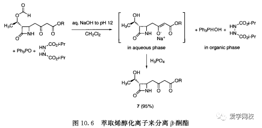 在大多数液液萃取过程中,是将杂质萃取到水相中,而未离子化的产物仍留在有机相中。可离子化的产物也可以通过萃取后处理来纯化,例如,胺可以先用酸性水溶液将其洗到水相中来除去酸性及中性杂质,然后将水相碱化并用有机溶剂萃取来纯化;酸性产物可以用碱性水溶液将其洗到水相中来除去碱性及中性杂质,然后将水相碱化并用有机溶剂萃取来纯化。在后处理过程中应该利用产物中官能团,这是-一个持续的过程[6]。图10.6分离亚胺培南中间体就是-一个很好的例子。