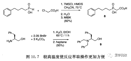 溶剂量是可以计算出来的。例如,如果第一次用有机溶剂萃取时90%的产物从水相中提取出来,第二次使用比原溶剂量10%多的体积就可以很好地提取剩余溶质。通过实验可以确定最少及实际有效的溶剂量。为操作方便,萃取通常情况下是在室温条件下进行;较高温度条件进行萃取可以使用较少的溶剂量,是因为物质溶解度在高温条件下增加。在分离膦羧酸8时,萃取操作在30~35C进行是为了减少使用的溶剂量(图10.7)[8];正如预料的,在较高温度萃取时水的量会有所增加。在分离氨基醇9时(图10.7),在65C进行萃取操作,冷却萃取液产品会结晶析出[9]。