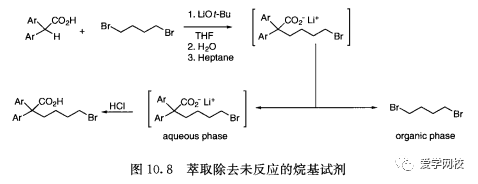 当无法避免多次萃取,在实验工厂中会使用更有效的操作或者生产设备[10]。很多萃取器是反向装置,像Karr往复板式塔,密度小的相会不断流向萃取器的底部,而密度大的相则在萃取器的顶部。反应后处理中采取萃取可以使操作更加安全,例如,用正庚烷可以有效地把未反应的1,4-二溴丁烷从含有碳酸锂中间体的水相中除去(图10. 8)0。如果不采取这步操作,具有催泪性的1,4-二溴丁烷很难从反应中除去。在大规模的生产中这种化合物会对工作人员有刺激性,特别是用干燥机来分离产物时
