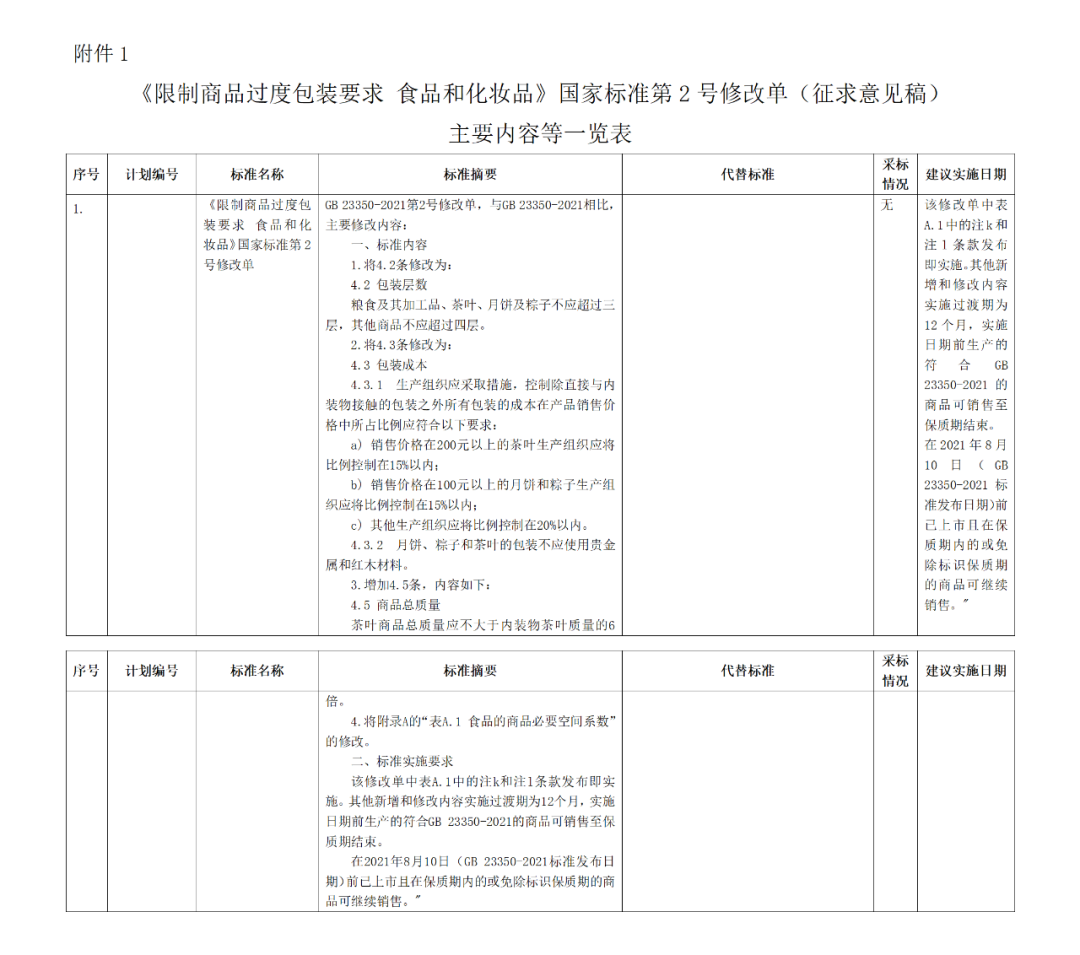 《限制商品过度包装要求 食品和化妆品》国家标准第2号修改单(征求意见稿)主要内容等一览表