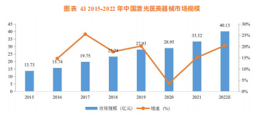 求美者消费习惯变化以及激光医美器械适应症广,未来市场空间巨大。从求美者的消费习惯上看,未来激光治疗将成为新时代女性的优选。创伤小、恢复期短、风险低的轻医美项目相比手术类项目很大程度上降低了消费者的决策成本,越来越受到消费者的青睐,未来轻医美市场占比将进一步提升,将成为中国医美市场的主力市场。注射类及光电类两大类轻医美项目未来随着医美市场的不断扩容,预计市场份额将进一步的扩大,而激光医美器械作为能量源医美器械行业最大的子行业,未来的市场想象空间非常大。从激光治疗适应症上看,未来国产激光有望抢占进口强脉冲光的市场份额。实质上,激光治疗适应症与强脉冲光治疗存在一定程度的重叠,例如:皮肤紧致,改善暗沉、缩小毛孔等。而目前,主流光子嫩肤设备都被进口产品垄断。相较之下,国产激光可以在价格端做的更低,且治疗效果可以对标进口的强脉冲光,尤其是针对单一皮肤问题治疗,具备很强的竞争优势。如长脉宽 1064nm 激光,可以通过选择合适的脉宽和能量,分别在去除红血丝、治疗痤疮、皮肤紧致、缩小毛孔等治疗中,完全有望取代强脉技术,交出满意答卷。未来随着国产优质设备的获批上市,将会和进口的光子嫩肤市场展开直接的正面竞争,考虑到国产激光设备价格及疗效优势,可预期未来市场将会呈现完全不同的格局。医美行业进入强监管时代,利好国产合规企业。目前医美行业中,使用水货产品、山寨产品和超适应症器械的情况普遍存在。产品紧缺、大额价差促生了庞大的光电医美设备山寨产品、水货产品市场。进口类光电医美设备在中国的销售一般采用代理模式,海外公司通过代理销售公司取得 NMPA认证、营销网络建设等一系列销售所必要的前提条件。医美器械行业超适应症宣传的情况普遍存在,具体表现为将部分Ⅰ、Ⅱ类器械用作第Ⅲ类器械,同时国内部分厂商的Ⅱ类器械产品,被医美机构超适应症宣传,行业乱象丛生。随着强监管时代到来,合规性的提升是中国医美产业中长期政策监管核心,“趋严趋规范”是主旋律,无论是针对上游制造商、下游医美机构还是宣传平台,立法执法机关已逐步从由被动治理转为主动出击,从以往的治理乱象净化行业环境,到建立健全相关标准、体系,完善监管系统。数据显示,医美行业进入强监管以来,2017-2020 年,医美行业行政处罚件数同比提升 247%。2017-2020 年,医美行业裁判文书数量同比提升 104%。中国医美行业野蛮生长的时代已去,未来企业需更加关注品牌美誉,此外未来医美行业的管理、技术、教育和基础设施将往标准化、高效化、高质量的方向加速健康发展。监管趋严,正规医美器械市场潜力巨大。根据艾瑞咨询统计,2019 年市场上有 9.3 万家机构开展医美项目,而其中仅 1.3 万家为合法医美机构。非法医美机构所用设备大部分由假货与水货构成,侵蚀了部分正规医美设备市场规模,此外因为进口设备的采购和使用成本太高,目前大部分合规机构都是采用租赁设备,未来随着国产设备的获批,预计将以较低的价格取代下游端的租赁市场。因此可以预见,随着光电类医美项目的不断普及,以及监管政策的持续规范,正规光电市场规模具备长足发展潜力,未来国产合规企业将迎来良好的行业发展环境。3、进入壁垒高:激光类器械准入门槛高,企业先发优势明显中国医疗美容市场中游主要由专门从事医疗美容器械以及药品研发制造的企业组成,准入壁垒相对较高。根据 Frost & Sullivan 报告,近年来,随着国内企业研发能力飞速发展,国产企业的市场竞争力不断增强,产业链中游国产替代趋势明显。中国医疗美容非手术类产品中游市场的主要进入壁垒包括综合研发能力、执行临床试验及获得监管批准的能力、品牌认可度、提供全方位产品组合的能力、销售及营销能力等五个方面。• 综合研发能力。综合研发能力对于医疗美容非手术类产品极为重要,其中包括根据人体的特征、机理和解剖结构进行医学研究的能力,以及就原材料和配方成分的特征进行研究的能力。获得该等能力需要大量时间和资源,这对新市场进入者构成挑战。• 执行临床试验及获得监管批准的能力。大多数医疗美容非手术类产品被国家药监局归类为第 III类医疗器械或药品。在商业化前通常需要进行严格而漫长的产品注册及与制造有关的测试,并且可能需要数年时间才能完成。• 品牌认可度。医疗美容非手术类产品一般对消费者产生直接且即时的效果,企业在市场的成功取决于消费者、医师及医疗机构对于品牌的认可度,他们往往倾向于采用安全且疗效好的品牌产品。• 提供全方位产品组合的能力。为解决不同消费者群体的各种医疗美容问题,提供全面的医疗美容产品组合对于该市场的公司而言是一个竞争优势。• 销售及营销能力。与下游医疗美容机构及经销商积极和可持续的合作是市场上成功参与者不可缺少的因素。对中游市场的公司来说,拥有稳固的关系及网络,以及在市场上推广产品的强大能力非常重要,这对资源较少及缺少经验的新进入者是一个高壁垒。其中,大部分光电类医美仪器属第三类医疗器械,激光具备较高准入门槛,企业先发优势明显。国内光电医美设备大部分属于第 III 类医疗器械,审批周期一般在 3 年左右,而目前市场上水货、超适应症医疗器械产品比较普遍。在