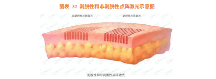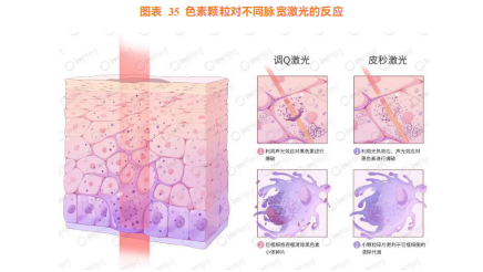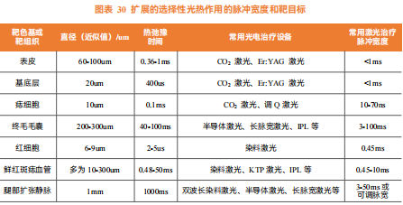 足够引起靶色基热损伤的能量。当激光的能量足够大时,靶组织将会被热能摧毁,摧毁的形式依照能量的高低、色基的不同、作用时间的快慢、光源的不同,可以是崩解、热变性、坏死、气化等。选择能在靶组织上产生足够的温度,使之破坏的合适的能量是保证疗效的前提。连续激光的能量密度(J/cm2)=(功率×时间)/光斑面积,相同光斑面积,相同功率,光的作用时间越长,能量越大,损伤越大。而对于脉冲激光:能量密度(J/cm2)=能量/光斑面积,能量大小不影响穿透深度,但会影响不同界面能量的分布。小于或等于靶组织的热弛豫时间。热弛豫时间(TRT)是指受热的靶组织通过热扩散将其吸收的能量降低 50%所需的时间,大多数靶组织可以采用简单的经验算法 TRT≈d2(近似值),TRT 以秒(s)为单位,d 代表靶点大小,以毫米(mm)为单位。靶色基的热向周围组织发生的这种热传导的过程就是热弛豫,而衡量热弛豫速度的快慢就是热弛豫时间,实际上就是衡量组织冷却的快慢。根据光学理论,只要使激光的脉冲持续时间小于或等于靶组织的热弛豫时间,就不会引起周围组织的热损伤。其中色素性病变中黑色素颗粒非常微小(0.2-0.5μm),其 TRT(0.25μs)<1μs,因此治疗色素性病变应使用脉宽为纳秒级甚至皮秒级的激光。因此要产生选择性光热作用效应,必须具备有三个基本条件:1、被靶色基优先吸收的波长;2、小于或等于靶组织热弛豫时间的脉冲持续时间;3、足够引起靶色基热损伤的能量。2、扩展的选择性光热作用原理对于脱毛和皮肤血管性疾病的治疗热损伤时间(TDT)是指靶色基吸收光能转化为热能后,将热能传导至远处的靶组织并引起损伤的时间,即整个靶组织包括黑色素及毛囊冷却约 63%的时间,这个时间要长于热弛豫时间,这一理论被称为扩展的选择性光热作用原理,是选择性光热作用的一个重要补充和扩展,强调对靶色基以外靶组织的治疗需要考虑组织的热损伤时间。对于脱毛和皮肤血管性疾病的治疗,激光治疗的靶目标并不是靶色基(黑色素和血红蛋白),仅利用选择性光热作用原理不能达到治疗预期。因为脱毛治疗的靶色基是黑色素,而治疗的靶目标是毛乳头和毛囊干细胞,两处均不含黑色素。同理,激光治疗血管时,靶色基是血红蛋白,而需要治疗的靶目标是血管内皮细胞,所以按照选择性光热作用原理,治疗所用的激光能量是相对不吸收的,激光对治疗靶组织也相对无作用。在脱毛治疗中,治疗的靶色基(黑色素)存在于毛干和毛鞘内,毗邻毛囊的生长部位毛乳头和毛囊隆突部位的毛囊干细胞。为达到理想的脱毛效果,激光的能量除了要破坏毛发本身外,还应破坏毛囊中的生发部位,因此治疗时需要将脉冲宽度适当延长,使得毛干及毛鞘内的黑色素因为吸收光能所产生的热能有充足的时间扩散到邻近的毛囊隆突部位和毛根部,使毛囊干细胞或者毛乳头生发部位发生不可逆地损伤。同理,在皮肤血管性疾病的治疗中,治疗的靶色基(血红蛋白)位于血管内,毗邻血管壁的血管内皮细胞,激光的能量被含氧血红蛋白吸收后产生的热能传递至血管壁邻近区域的时间需长于靶组织的热弛豫时间,才能起到治疗的作用,这就是临床上用长脉宽或者超长脉宽激光治疗血管性皮损的基础。因此,要想达到损害靶组织(毛乳头和毛囊干细胞、血管内皮细胞)的目的,需要一个较长的脉冲宽度以便使激光的能量有足够的时间从靶色基(黑色素和血红蛋白)传导到靶组织(毛乳头和毛囊干细胞、血管内皮细胞)中。扩展的选择性光热作用的脉冲宽度和靶目标。光与组织的作用时间延长,靶组织的清除效果增加,但势必增加非靶组织的损伤,这是因为当组织的靶色基吸收激光的能量后,转化为热能,必定会向周围邻近组织发生热传导。热传导的多少与激光的脉冲持续时间成正比,时间越长,热损伤的范围就越大。对于毛囊、异常血管等靶目标,需要根据其大小来推算其热弛豫时间,并采用相应的激光器与脉冲宽度。对于血管性皮肤病,激光作用于血管的时间必须足够长,以便热传导从血管腔的红细胞到整个血管壁。3、局灶性光热作用原理可使皮肤重塑紧致,改善面部年轻化选择性光热作用原理是提高靶组织对光热吸收的同时降低光热对非靶组织的损伤。应用于面部年轻化的治疗时,其靶色基是水,其吸收激光能量后转化为热能,引起所在真皮组织的热损伤,进而启动真皮组织的修复再生过程,达到皮肤重塑紧致功效,即通过对真皮组织损伤后的修复达到年轻化的目的。为了增强激光对真皮组织的刺激同时尽可能减少损伤带来的副作用,局灶性光热作用原理应运而生。2004 年,哈佛大学的 Rox Anderson 博士等人共同提出了局灶性光热作用,也称点阵式光热分解作用。它是将一个激光光斑均匀地分成相同直径大小的小光斑,在小光斑上作用的能量密度很高,可以穿透表皮,甚至到达真皮层,产生不伴有周围组织损伤的微热损伤区或称显微剥脱区,从而在保证疗效的前提下,降低治疗后的副作用。剥脱性和非剥脱性点阵激光。基于局灶性光热作用原理,点阵激光(fractional laser)治疗模式被设计出来。其光束排列成点阵状,并对皮肤真皮组织进行强热刺激,从而成为一种新型的激光治疗模式。目前,该类激光分为非剥脱性和剥脱性两类。前者被水轻度吸收,不会损伤表皮角质层,表皮组织凝固但不气化,激光光束仅仅引起一个柱状的热变性区域(并非真