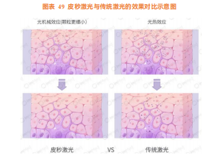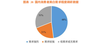 皮秒激光在皮肤可以产生空泡效应,可作用于浅层细纹,使皮肤年轻化。皮秒激光能够“美白嫩肤”的作用机理,即激光诱导的光击穿效应(laser-induced optical breakdown, LIOB),也被称为“空泡效应”。根据皮秒激光专家共识,通过蜂巢状聚焦透镜或全息衍射透镜,皮秒激光可以聚焦成大小一致间隔均匀的点阵光束,由于其中每一微光束具有极高的峰值功率,超过靶色基(黑色素或血红蛋白)的光分解阈值时,靶色基非线性吸收能量产生光分解效应,形成等离子体,等离子体继续高效吸收激光能量同时不断扩展,最终产生爆破现象在表皮或真皮层导致空泡的形成,即为激光诱导的光击穿。LIOB 周围组织无损伤,炎症反应也很轻微,伴随着 LIOB 的发生,真皮中可出现新生胶原和弹性纤维。LIOB 效应使点阵皮秒激光具有改善光老化和痤疮凹陷性瘢痕的治疗作用,而且相比于剥脱性点阵激光和近红外的非剥脱性点阵激光,不良反应更小,几乎没有误工期。根据皮秒激光专家共识,皮肤年轻化是皮秒激光应用的适应症之一。皮肤老化常伴随表皮变薄,真皮胶原减少,真表皮连接紧密性降低,真皮乳头、毛细血管和皮肤附属器萎缩或减少等一系列病理生理改变。临床表现为皮肤干燥粗糙、松弛缺乏弹性、皱纹增加、色泽暗淡、毛孔粗大、斑点斑块等。目前主要通过755nm和1064nm皮秒激光对面部进行年轻化治疗。皮秒激光对改善皱纹,实现面部年轻化具有积极的治疗作用。激光美容产生于 20 世纪 60 年代,被称为“激光医学奠基人”的 Goldman 博士将红宝石激光应用于良性色素病变和纹身治疗并取得成功,开创了激光医学应用的先河。经历了 70 年代的临床试验,80年代的学科发展,进入 90 年代的成熟阶段,激光美容技术逐渐涌入我国市场,并趋向普及。激光医美器械是通过不同介质制成的激光器发出的各种波段激光作用于人体表面后,发生光子生物学效应,从而达到祛除面部各种色素,痘印等美化肌肤的目的,但不伤害周围皮肤组织的医美器械。医美市场上,激光美容仪器通过“轻度介入”的方式达到整形美容的效果,成为美容医疗市场的中坚力量,其可用于祛斑美白,嫩肤、皮肤年轻化、脱毛等领域。按照激光介质的不同,激光医美器械可分为氩气、氦氖、红宝石、翠绿宝石激光医疗器械。1、需求分析:新时代求美者越来越注重肤色、肤质、皮肤年轻化改善美白消费成为刚需,市场发展潜力大。我国自古就崇尚白皙的皮肤,它作为美丽女子必不可少的特点之一。著名戏剧家李渔在《闲情偶寄·声容部》中写道:“妇人本质,惟白最难。常有眉目口齿般般入画,而缺陷独在肌肤者。”意思是女人肤白最难得,有些女人五官绝好,但肤色不白,着实遗憾。李渔作为我国古代文人对于女性美观念的集大成者,认为“肤白”是女性美的第一标准,可见“以白为美”的观念由来已久、根深蒂固,甚至随着主流话语权的扩大而愈演愈烈。我国大部分国民的基础肤色整体偏黄,而大多数中国人存在“一白遮百丑”的审美观念,因此对祛斑美白一直存在持续的需求。此外,在快节奏的时代背景下,各方面的压力和不良的生活习惯导致人们出现各种毛孔粗大、肤色不均、暗沉等肌肤问题,人们对美白产品的消费需求也愈发强烈。根据美丽修行大数据显示,约 70%的用户有明确的美白需求,且需求程度较强。中国人对于美白的热情也体现在社交媒体上,在小红书上搜索“美白”,显示相关笔记数量高达 259 万+篇,搜索“肤色提亮”显示相关笔记也有 84 万+篇,美白消费逐渐成为刚需。