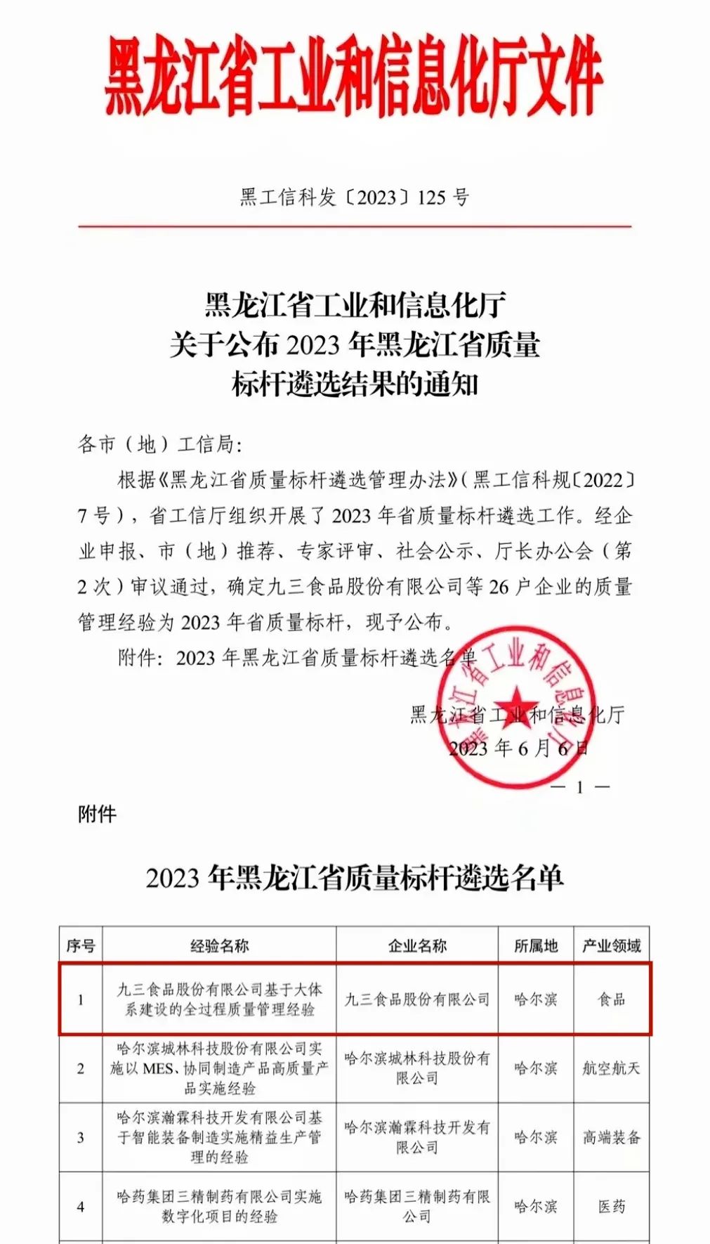 近日,黑龙江省工业和信息化厅公布了2023年黑龙江省质量标杆遴选结果,九三食品股份有限公司凭借“基于大体系建设的全过程质量管理经验”,荣获“2023年黑龙江省质量标杆”殊荣。