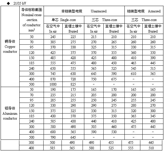 六、35kV铜芯、铝芯电缆载流量查询表