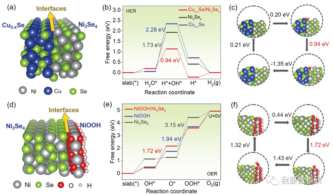 4. 机理研究揭示了Cu2−xSe/Ni3Se4界面上的Cu缺陷通过促进Cu原子与Ni3Se4的Se原子之间的电子转移,大大降低了HER的速率决定步骤的反应势垒。