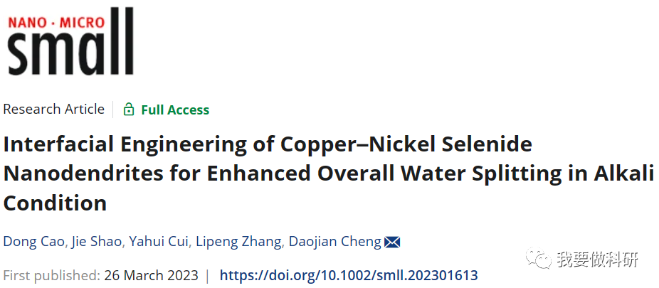 Dong Cao, Jie Shao, Yahui Cui, Lipeng Zhang, Daojian Cheng,Interfacial Engineering of Copper–Nickel Selenide Nanodendrites for Enhanced Overall Water Splitting in Alkali Condition,Small, 2023