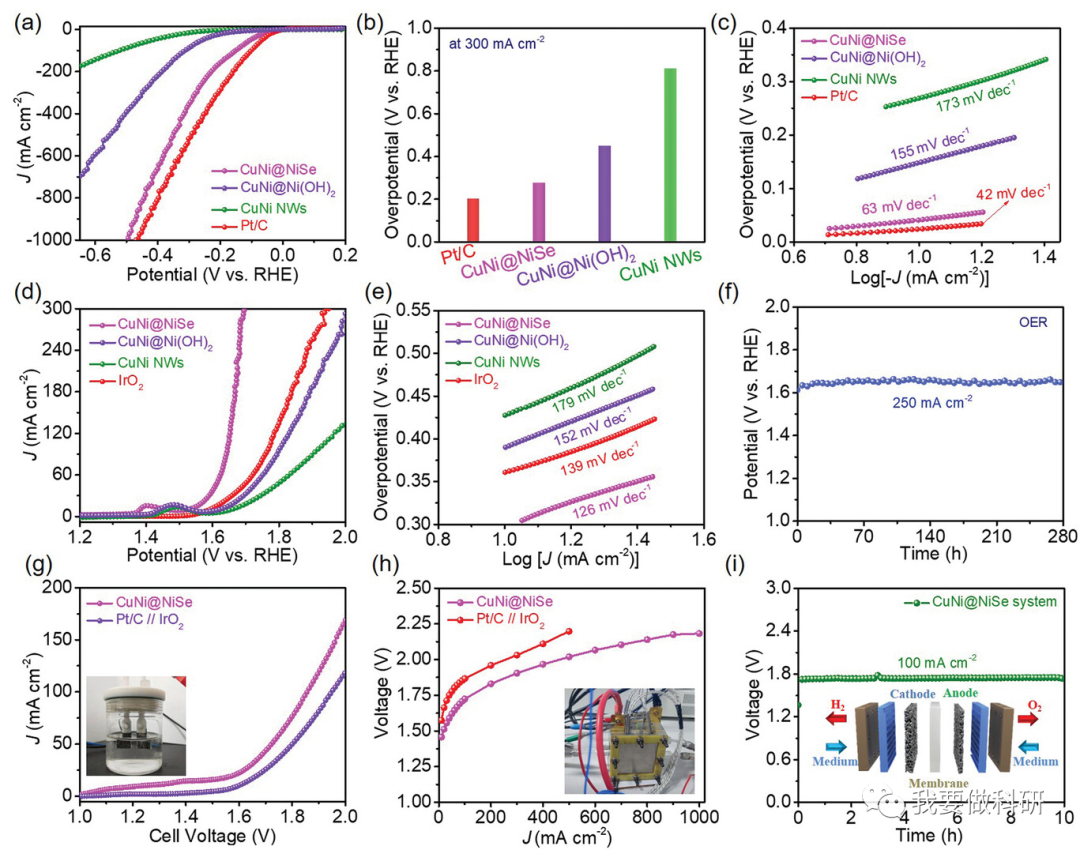 2. CuNi@NiSe在氧析出反应(OER)和氢气析出反应(HER)时,仅需分别293和41 mV的电势来实现10 mA cm−2的电流密度。