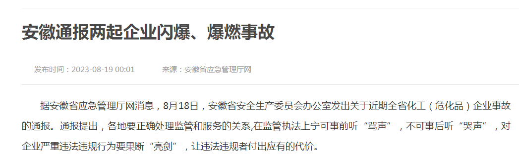 据安徽省应急管理厅网消息,8月18日,安徽省安全生产委员会办公室发出关于近期全省化工(危化品)企业事故的通报。通报提出,各地要正确处理监管和服务的关系,在监管执法上宁可事前听“骂声”,不可事后听“哭声”,对企业严重违法违规行为要果断“亮剑”,让违法违规者付出应有的代价。通报还提出,要督促企业严格落实“管生产经营必须管安全”要求,认真组织开展“三级”安全教育培训,切实提升生产部门及一线作业人员安全意识和安全知识技能,坚决杜绝管生产的不管安全、不重视安全。