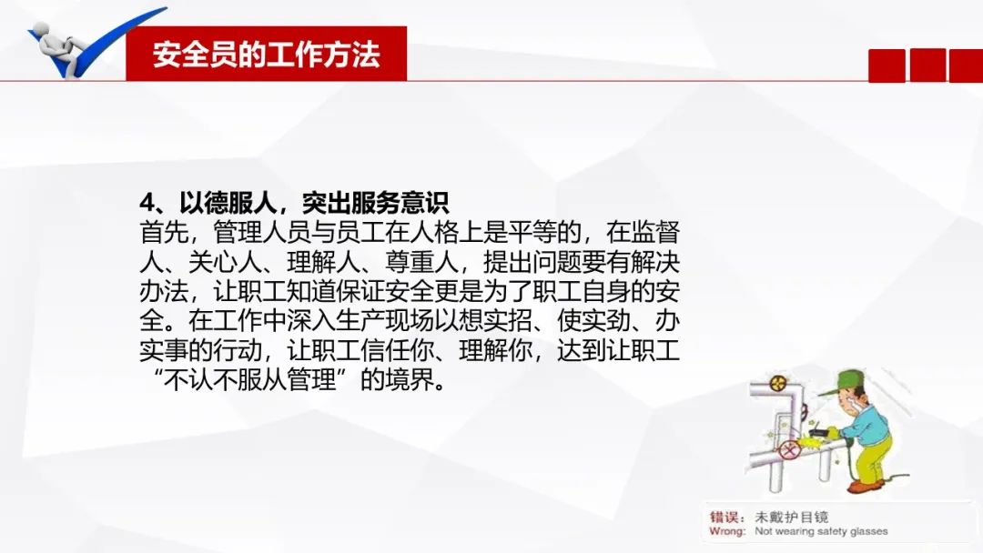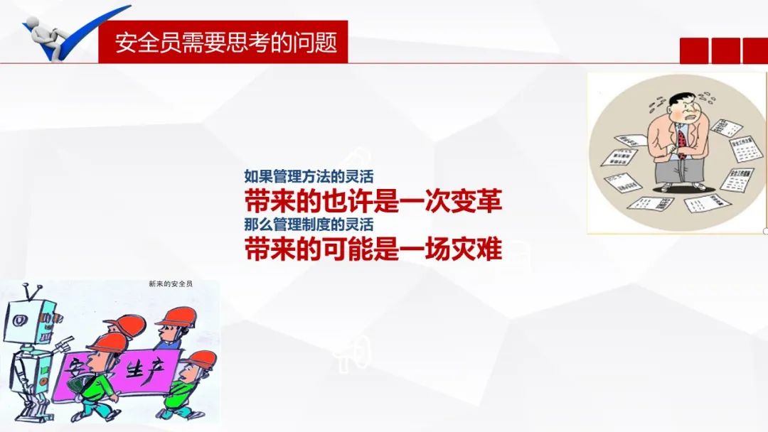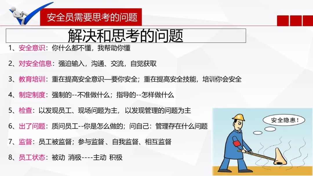 首先是建议,主要源自对现行法律法规和现场存在的问题,对企业的安全管理方面提出的新的必要的政策和管理的调整和要求,要及时的给领导一些建议。这既是领导“尽职免责”的法定要求,也是我们安全生产管理人员履职的必要义务,而这一义务源自全国人大在对《安全生产法》第22条的解读:“生产经营单位的安全生产管理机构和安全生产管理人员,是企业的主要负责人在安全事务方面的重要助手”。