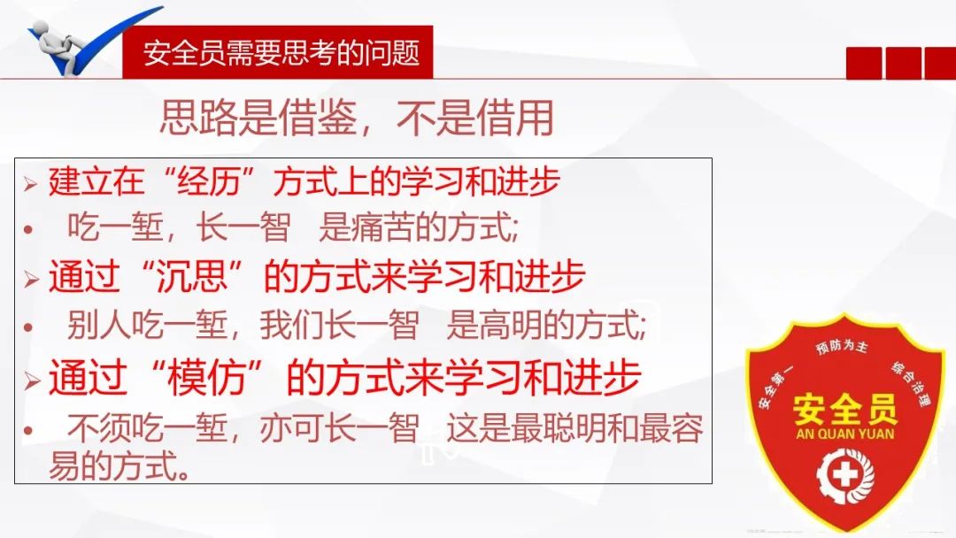 教育培训,这是两个被随时挂在口头上的一个词,但在我看来,他们其实是有不同内涵的。教育,侧重的是提高人的安全意识和理念;而培训,则更侧重于员工增加知识和技能提升。而这两者是从不同的角度来提高人的总体的安全素质。既然有不同的目的,所以在教育和培训方面便应该有不同的方法。比如,教育的素材应更多的采用事故和案例,让人有更直观的感受和更震撼的感触;而培训,则可以采用图文并茂、生动有趣、逻辑性和连贯性更强的方式,效果才会更好。