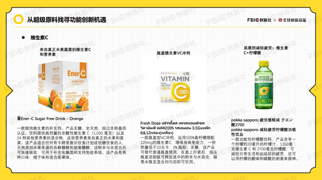 类比电解质,大众非常熟悉的维生素、矿物质等成分也仍然存在刷新认知的创新空间,以维生素C为例,因为与免疫、抗氧化、营养强化的功效绑定,可以帮助产品关联身体强化、美容护肤、抗疲劳等产品认知与消费场景心智。