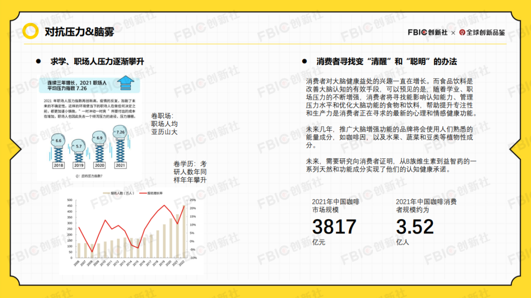 另一方面,求学、职场人压力逐渐攀升已是不争的事实。这也为能量饮料革新带来一个有趣的品类分化趋势和探索机遇,一边要让消费者变”清醒“和 ”聪明“,提升专注性和生产力;一边要让消费者大脑“解压”和“放松”,促进情绪疗愈。