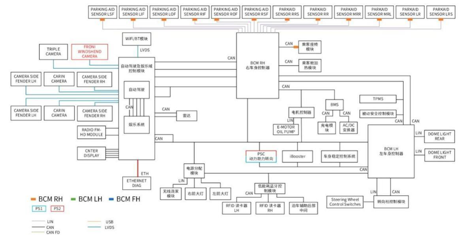 特斯拉采用的区集中式架构中,中央计算模块被称为AICM(Autopilot & Infotainment Control Module,辅助驾驶及娱乐控制模块),而区域控制器则包括BCM RH(Body Control Module Right,右车身控制器)和BCM LH(Body Control Module Left,左车身控制器),如图所示。