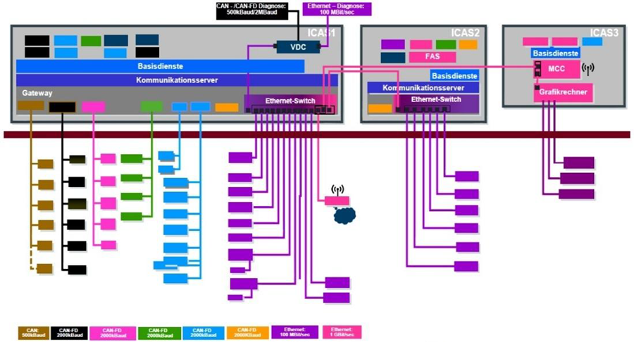 MEB是模块化电气化平台的德语缩写,是由大众汽车集团及其子公司开发的电动汽车模块化平台。MEB平台的E3架构采用了域集中式电子电气架构,其中包括3个车辆应用服务器(ICAS,即In-Car Application Server),如图所示。