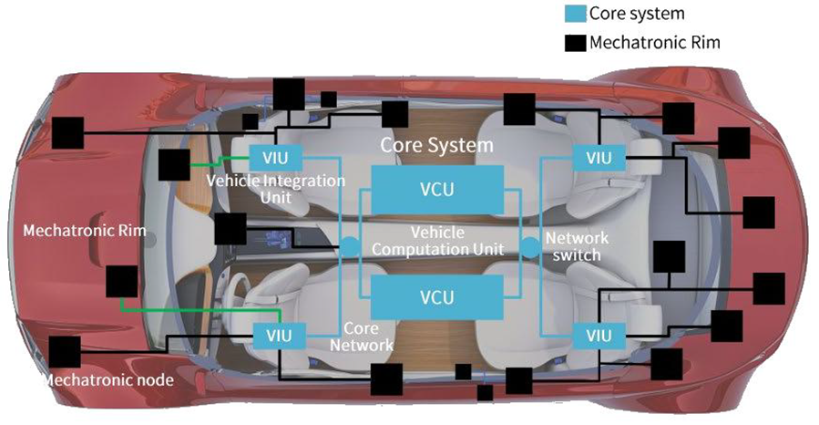 沃尔沃的Zonal EEA包括核心系统和机电一体化区域(Mechatronic Rim),并将ZCU(Zone Control Unit)纳入了中央计算集群中。同时,还定义了与核心计算系统相对应的概念:机电一体化区域,以VIU(Vehicle Interface Unit)作为节点,并可以划分出多个区域。VCU对应车载中央计算机,VIU对应区域控制器,如图所示。