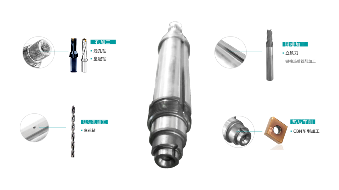 威士针对电机轴的全套加工提供车削、铣削、孔加工刀具,稳定性、可靠性更高,不仅满足电机轴注油孔、键槽和浅孔的高尺寸精密度要求,并且CBN硬车后的表面质量高。