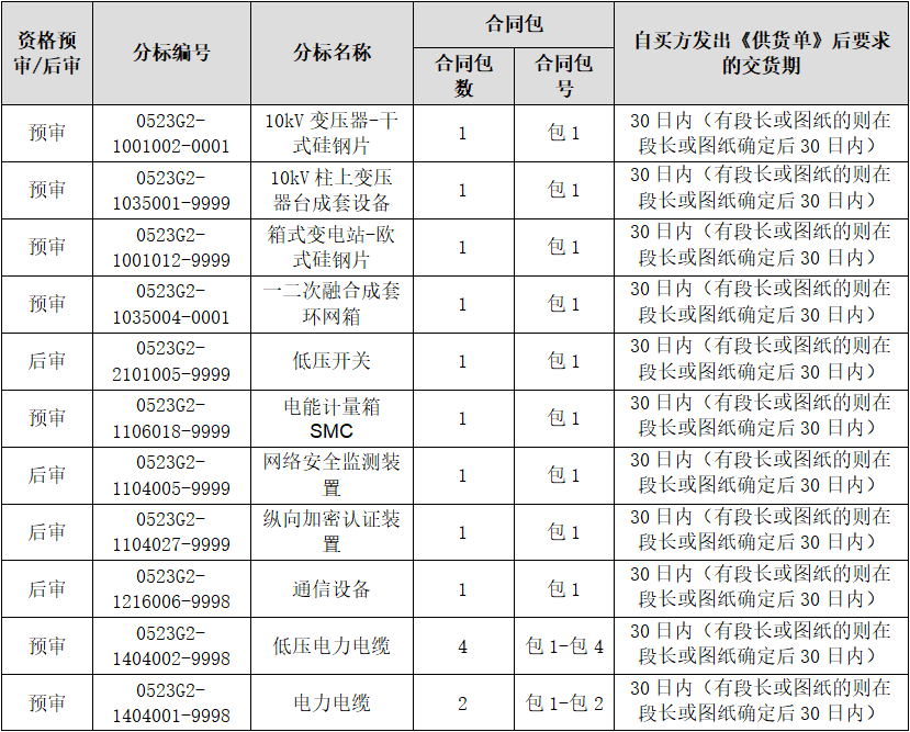 项目概况与招标范围按分标编号详见下表,货物清单单独成册(分标编号以此表为准,供货数量以货物清单为准)。国网资格预审投标资质齐全(高压电缆/低压电缆/架空绝缘导线/钢芯铝绞线)国网业绩好 绩效良好 诚招全国投标代理商合作共赢!联系电话:金先生 15931728888(微信同号)
