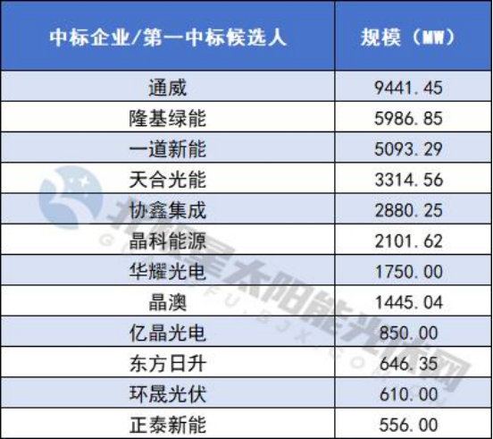 在明确中标企业及份额的37.62GW规模中,通威强势领衔,中标规模达到了9.44GW,隆基和一道新能排名第二、第三,所获规模分别为5.99GW、5.09GW,前三名占比就达到了55%;天合光能排名第四,拿到了3.32GW。