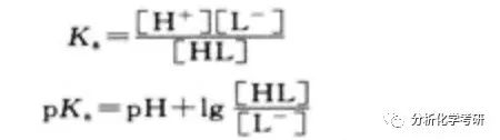 从上述公式可知,只要在某一确定的pH下,知道[HL]与[L-]的比值,就可以计算pKa。