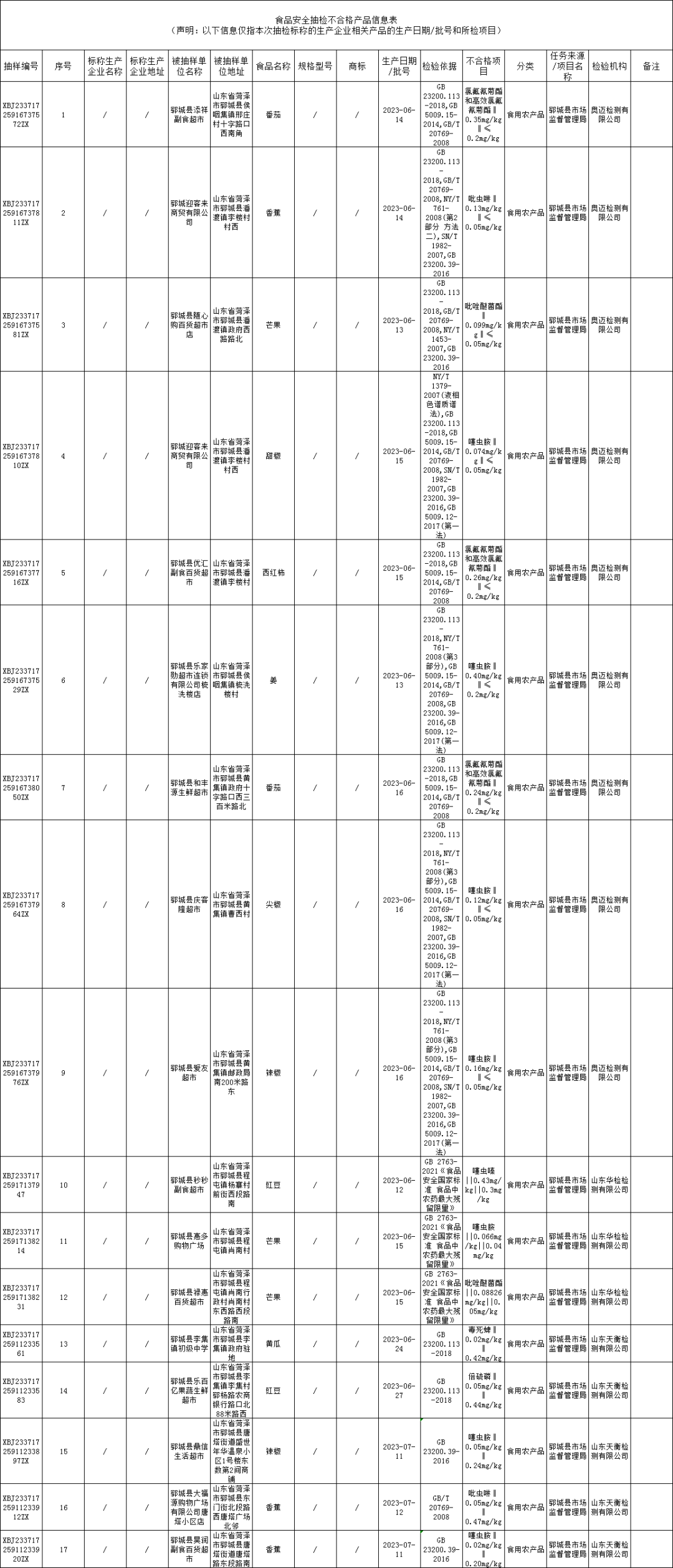 根据《中华人民共和国食品安全法》及其实施条例等有关规定和山东省食品安全监督抽检计划安排,为进一步保障食品安全,郓城县市场监督管理局对粮食加工品、调味品、糕点、糖果制品、淀粉及淀粉制品、食用农产品、饮料、餐饮食品、饼干、乳制品、食糖、豆制品等食品大类266批次产品进行了监督抽检,其中不合格产品17批次,检出了氯氟氰菊酯和高效氯氟氰菊酯、吡虫啉、吡唑醚菌酯、噻虫胺、噻虫嗪、倍硫磷不合格等问题(具体情况通告见附表)。根据食品安全国家标准,个别项目不合格,其产品即判定为不合格产品。针对抽检中发现的不合格产品,郓城县市场监督管理局将进行立案查处。郓城县市场监督管理局