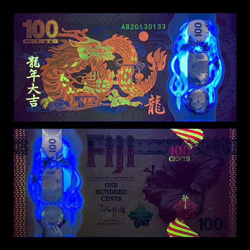 同时,斐济龙年生肖纪念钞的底纹和装饰条带也选用了富有斐济特色、又有吉祥寓意的塔帕布纹图案。