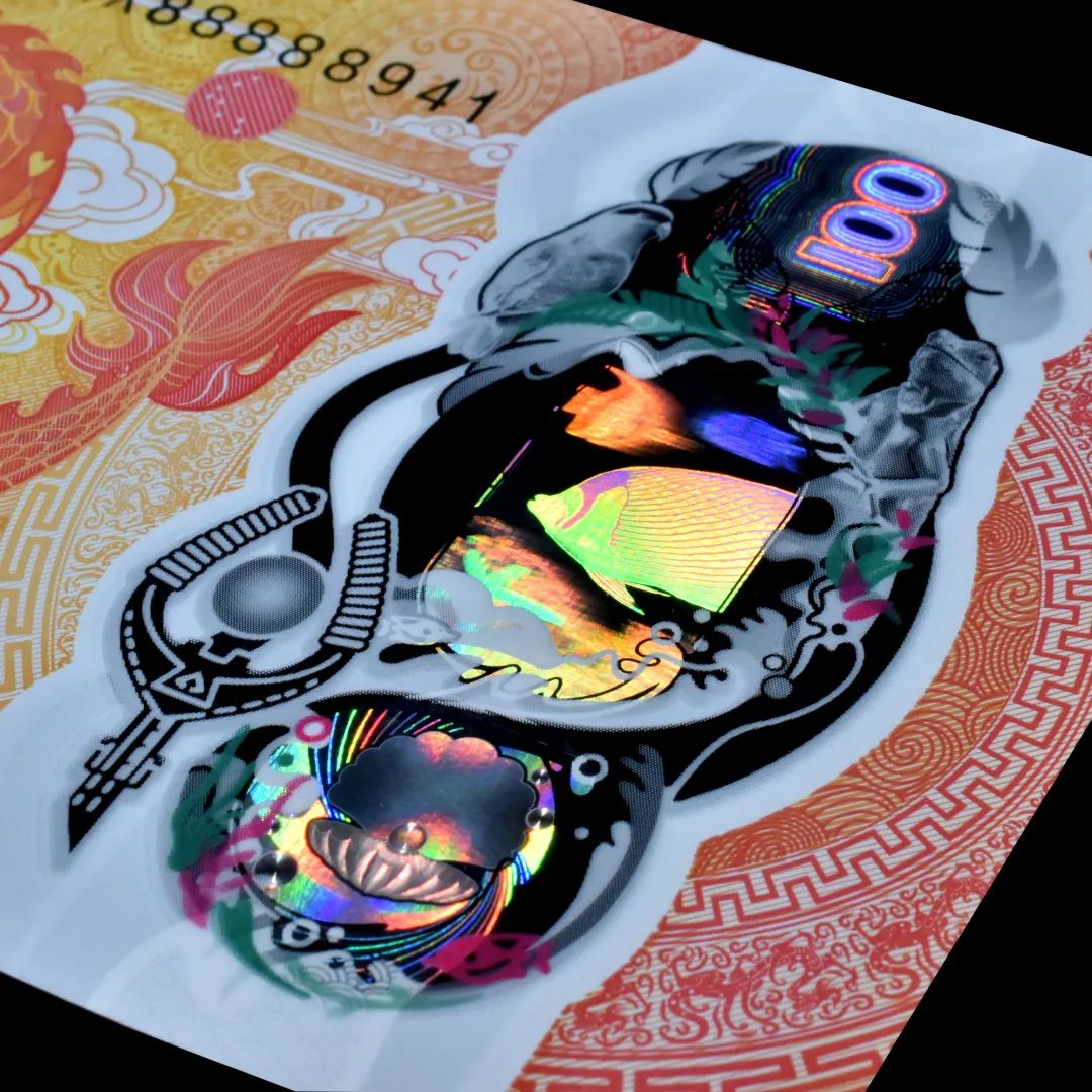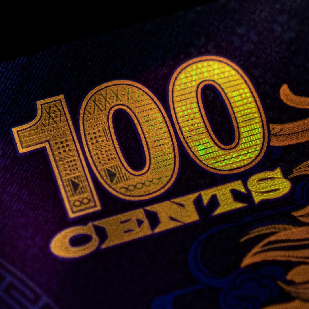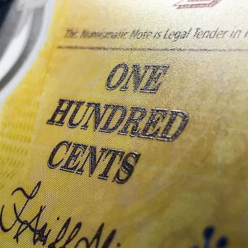 Gemini™增强型双子荧光技术的加持,在赋能美观及艺术性之余,使整枚纸钞更具有趣味性。金色菲涅尔效果立体镭射珍珠和超微缩镭射雕刻的英文为钞面带来了不同凡响的质感: