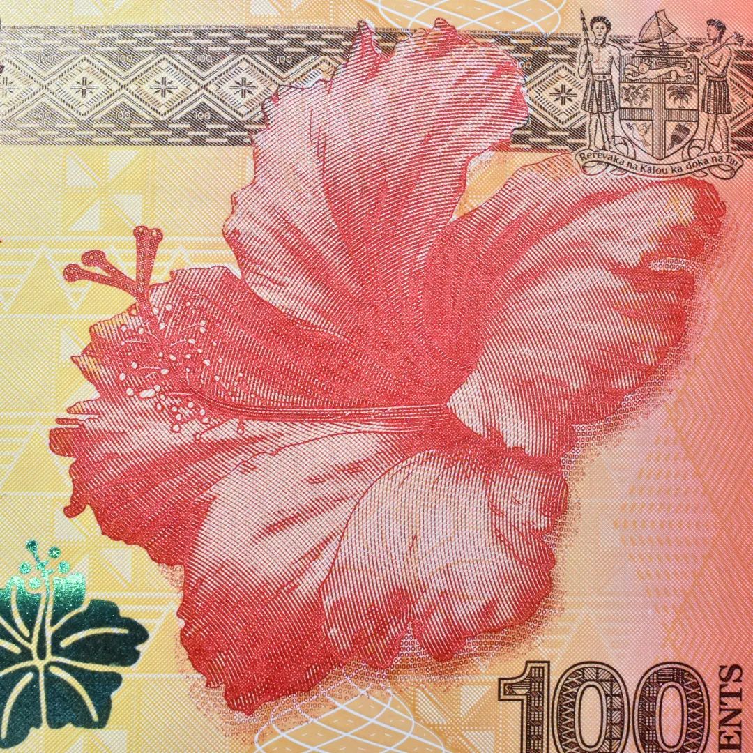 反面主图是一朵色泽鲜红的朱槿花,同时也是斐济国花。在当地,朱槿花深受广大人民所喜爱,寓意着吉祥、兴旺与爱。