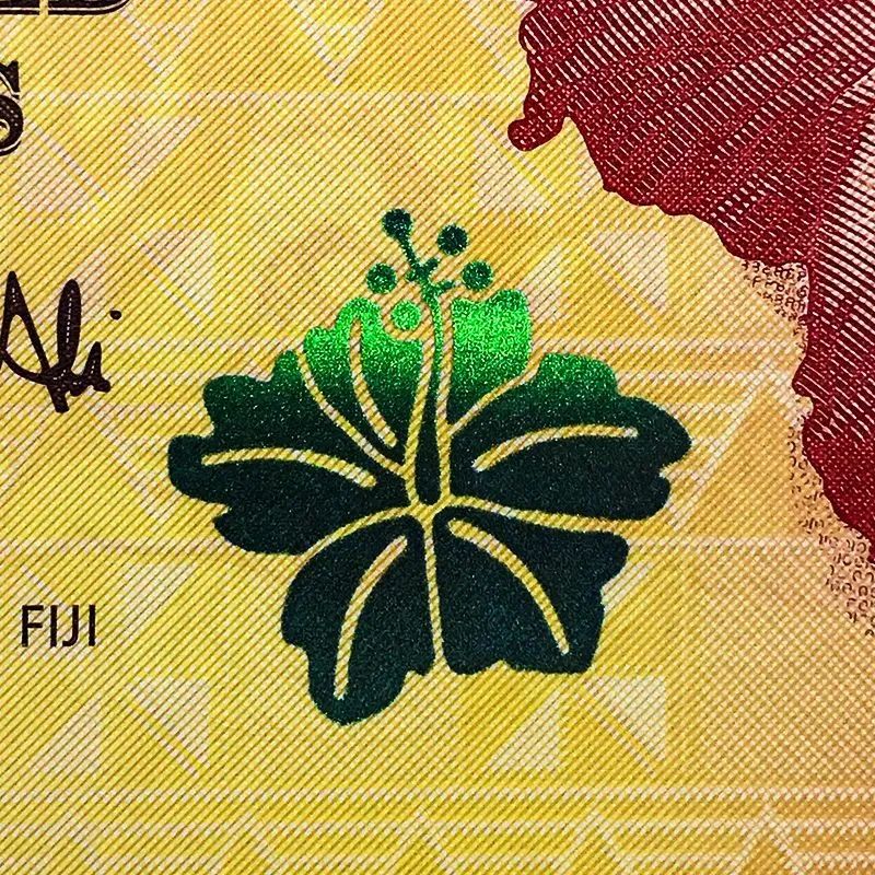 背面采用双色拼接,可机读凹印斐济国名,国徽、朱槿花、微缩文字100等,令画面丰富极具冲击力。