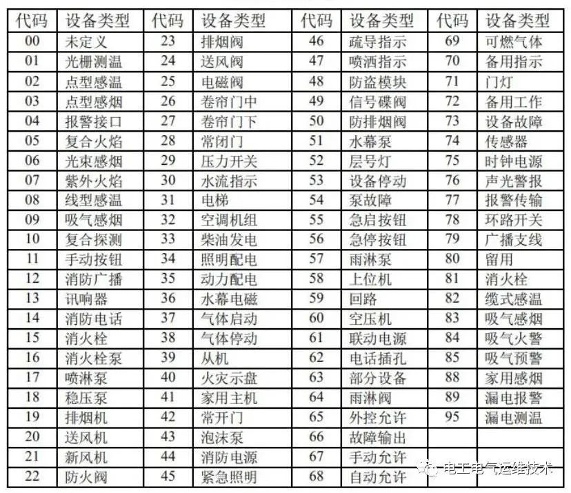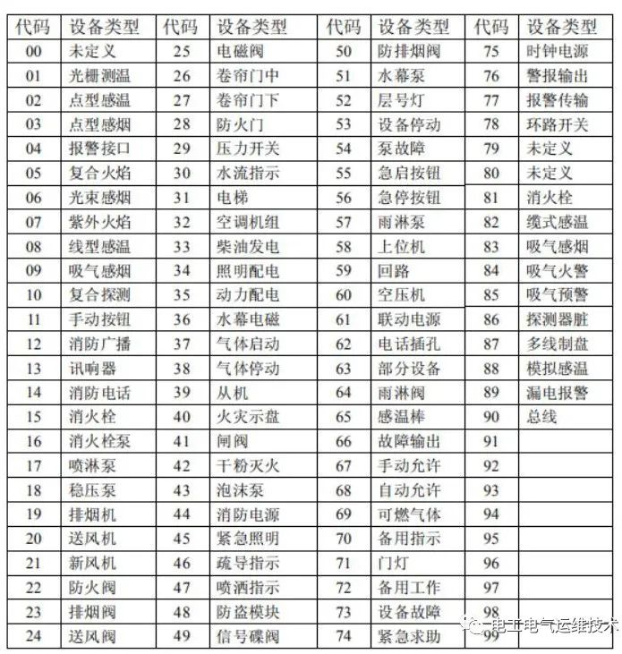 二、主机型号中不含H后缀的旧联动设备类型代码表,适用于海湾消防GST5000、GST9000型等火灾报警控制器。