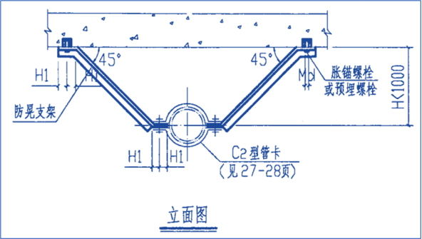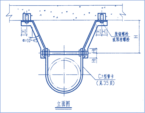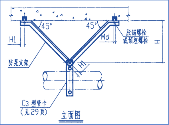 规范没有强调具体结构形式;而管道的图集更偏向于支架为三角形、或倒梯形的形式,且有防止管道沿管线方向、或沿垂直管线方向晃动两种形式。
