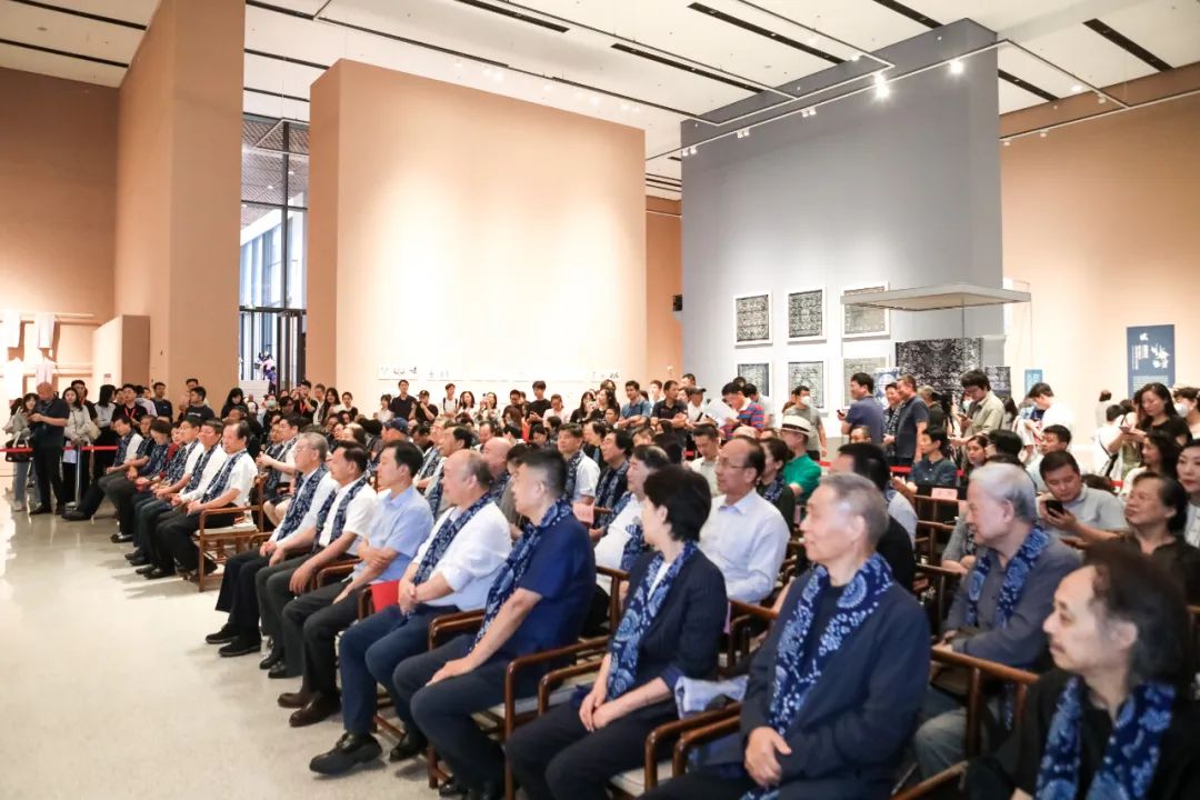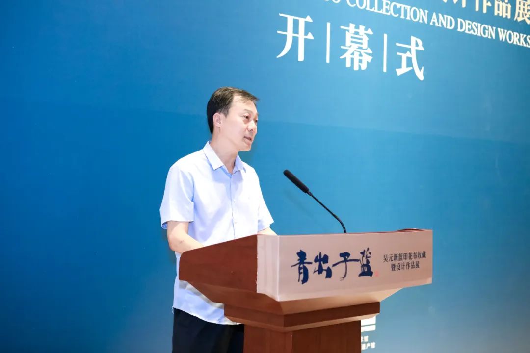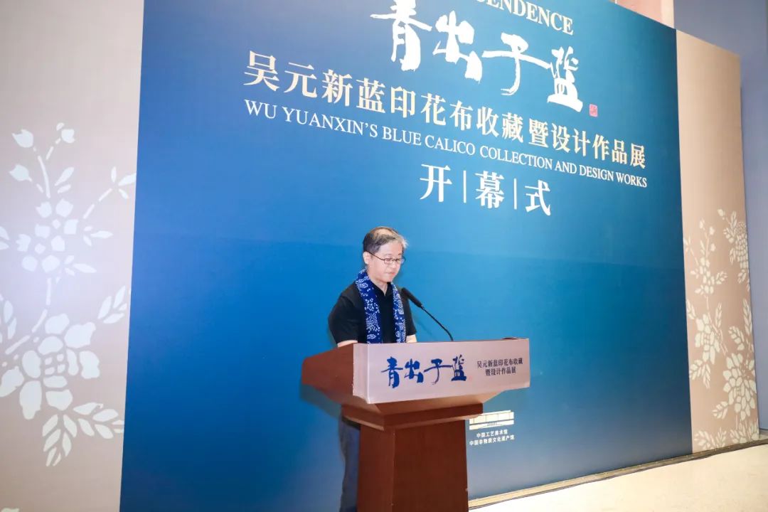 才大颖理事长在致辞中讲到:“盼望已久,终迎来今日之盛典。非常感谢中国工艺美术馆(中国非物质文化遗产馆),感谢所有的主办、承办单位,在大家的共同努力下,让我们有机会相聚在中国工艺美术界的圣地,共同见证‘青出于蓝——吴元新蓝印花布收藏暨设计作品展’的盛大开幕仪式。在此,我谨代表主办方之一中国工艺美术学会,向各位的到来表示热烈地欢迎并致以最诚挚地谢意!‘青出于蓝,而胜于蓝’,自古以来就心智于中华大地,其深入浅出的表达诠释了传承与创新的深刻哲理。今天,我们在欣赏元新先生蓝印花布收藏的同时,更多的是感悟这种传承创新的当代魅力,与其说是对传统工艺的珍视,不如说更是对创新设计的推崇。元新先生创作技艺高超、学术造诣深厚、设计理念独到、艺术眼光深邃,在中国工艺美术大师中可谓独树一帜。尤其是将蓝印花布的传统工艺融入到现代设计之中,赋予它新的生命与意义。这种融合不仅是对传统工艺的致敬,更是对时代精神的传递。元新先生在蓝印花布的引领上走出了属于自己的新时代。本次展览以‘终朝采蓝’、‘斑斓万象’、‘五彩彰施’、‘生生不息’四个板块,巧妙地呈现了蓝印花布的丰富内涵和多元面貌,让我们更深刻地感受到蓝印花布所蕴含的情感、智慧和艺术的魅力。这种传统工艺不仅仅是一种技艺,更是一种情感的传递,一种艺术的积淀,它融汇了中华文明的创造力和情感表达,跨越了时空,延续至今。不仅如此,本次展览还向我们展示了传统工艺在当代的意义和价值。它不仅仅是文化遗产的传承,更是创新的源泉,是与时俱进的生命之源所在。也正是因为有了这种传承与创新的精神,蓝印花布才能在不同的时代背景下,依然焕发着绚丽多彩的时尚光芒。元新先生不仅在学术研究上建树颇丰,更在设计创新和工艺传承上引领时尚。他深入钻研蓝印花布的历史、技艺和美学,为这一古老工艺注入了新的时代内涵。元新先生的成就不仅丰富了蓝印花布的表现形式,某种意义上,为工艺美术领域在‘创新传承’上树立了一个开拓者的典范。元新先生始终率先垂范,不遗余力,言传身教,鼓励着更多的年轻人投身于蓝印花布事业之中,推动代际传承,将传统工艺的智慧与审美传递给未来。元新先生始终关注教育,与院校紧密合作、相互赋能、产教融合,为培养蓝印花布的当代人才倾尽情怀,让我们在他身上,又看到了中国工艺美术大师的授业、传道、解惑之重。