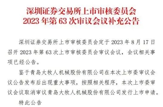 8月16日,据深圳证券交易所上市审核委员会 2023 年第 63 次审议会议补充公告,鉴于青岛大牧人机械股份有限公司(“大牧人”)在该次上市委审议会议公告发布后出现重大事项,本次上市委审议会议取消审议大牧人发行上市申请。