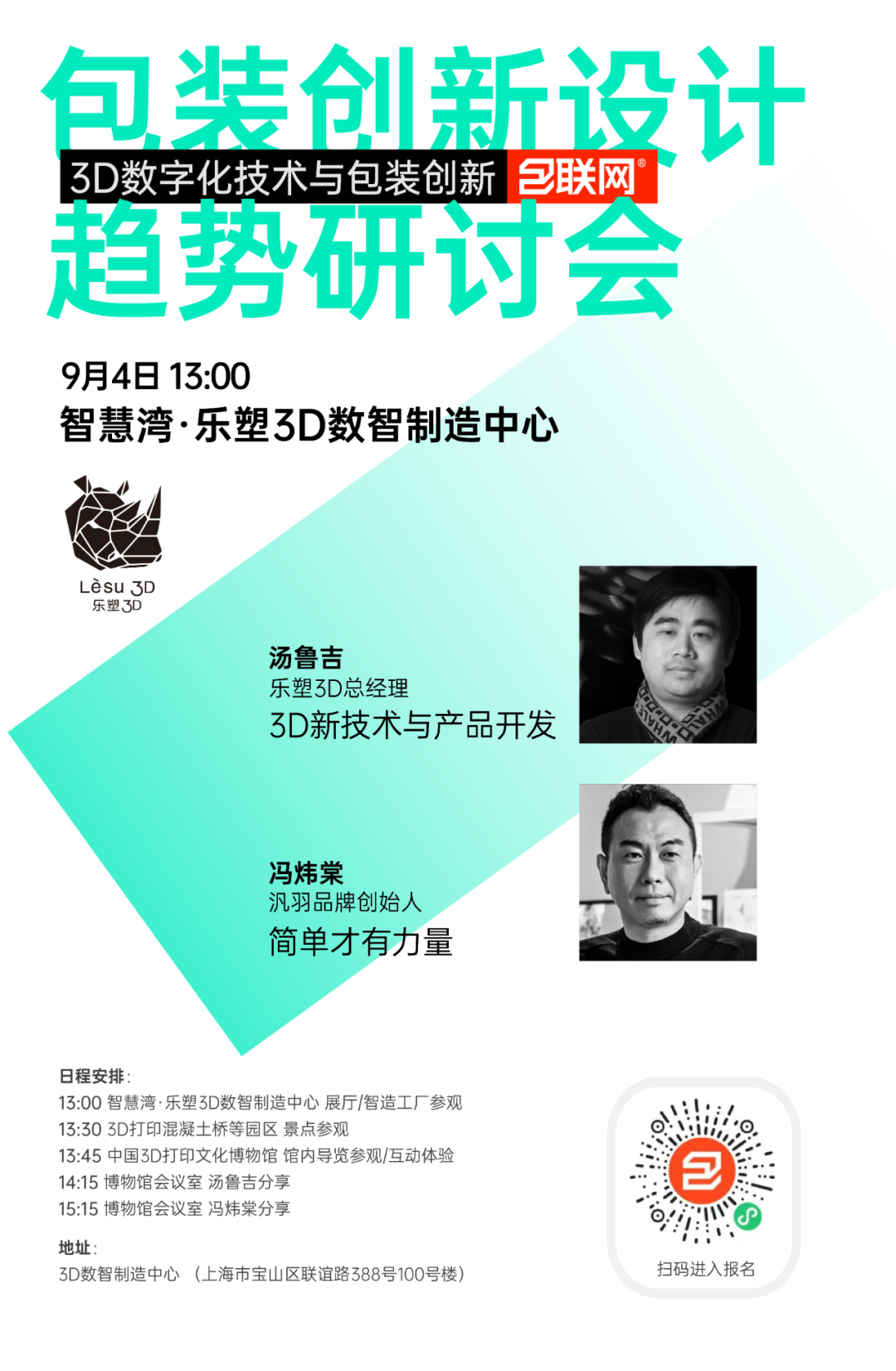 2023年9月4日,乐塑3D携手包联网,在上海智慧湾·乐塑3D数智制造中心举办“包装创新设计趋势研讨会”。并进行3D数智制造中心工厂参观、中国3D打印文化博物馆参观交流活动,参与互动体验3D打印新技术,感受创新应用发展趋势。欢迎大家面对面感受前沿3D数字化创新应用,共同探讨包装创新趋势。