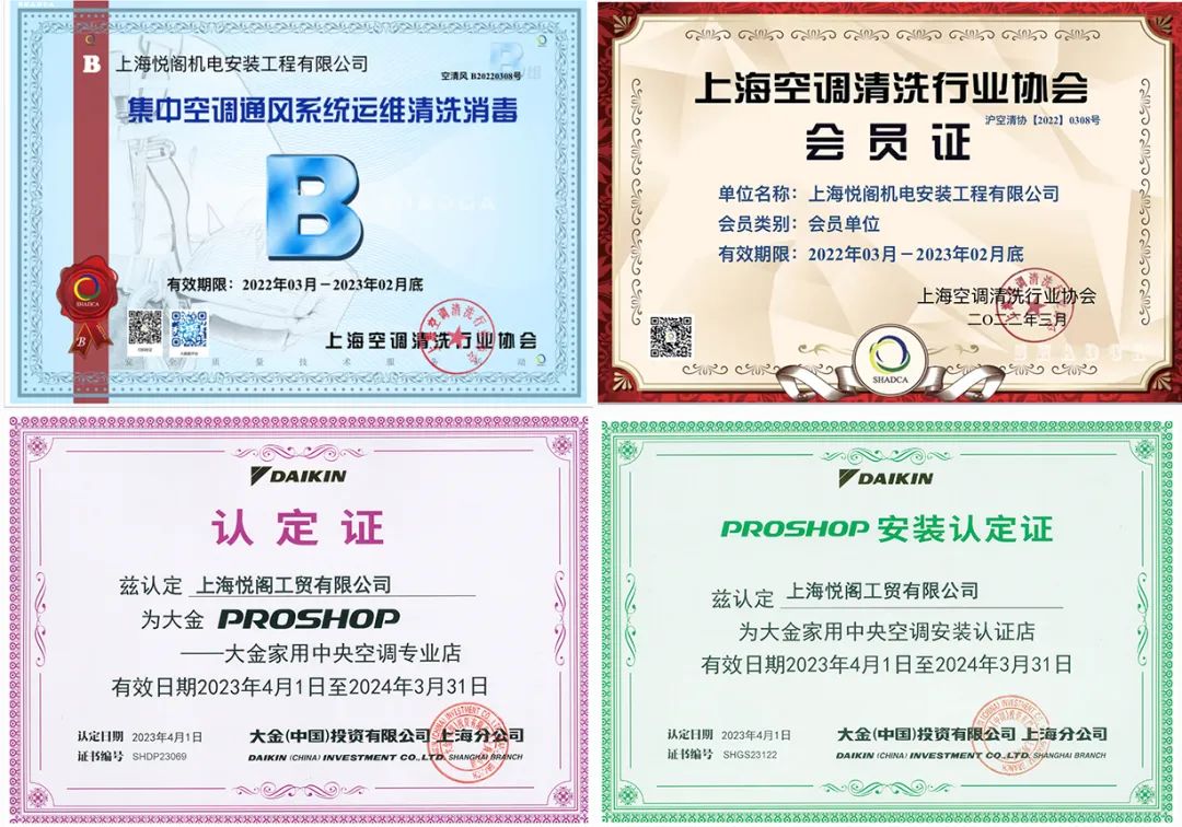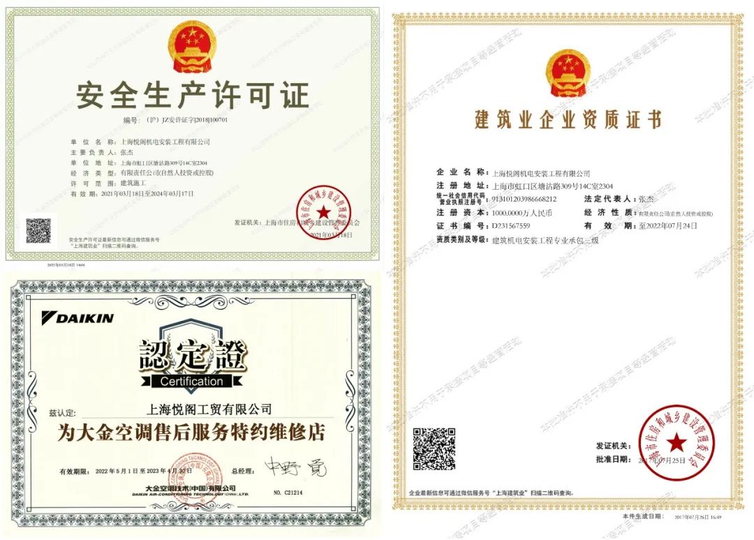 悦阁不仅持有《大金空调多联系统安装证》,并且持有《建筑安装资质证书》《安全生产许可证》,进一步对工程施工的质量保障。