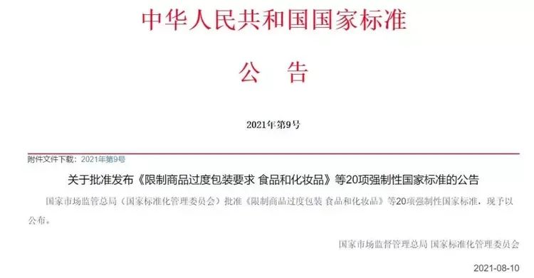 国家市场监督管理总局于2021年8月10日发布国家标准GB 23350-2021《限制商品过度包装要求 食品和化妆品》(以下简称标准)。为给生产销售企业一定缓冲,给予了2年的过渡期,该标准将于2023年9月1日正式实施。