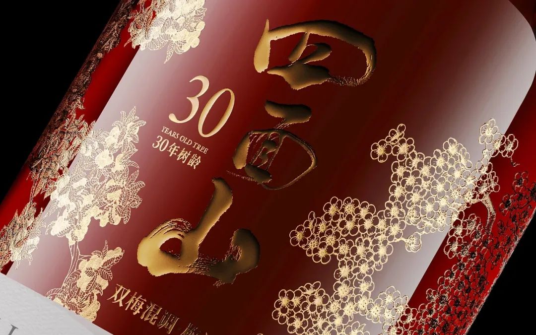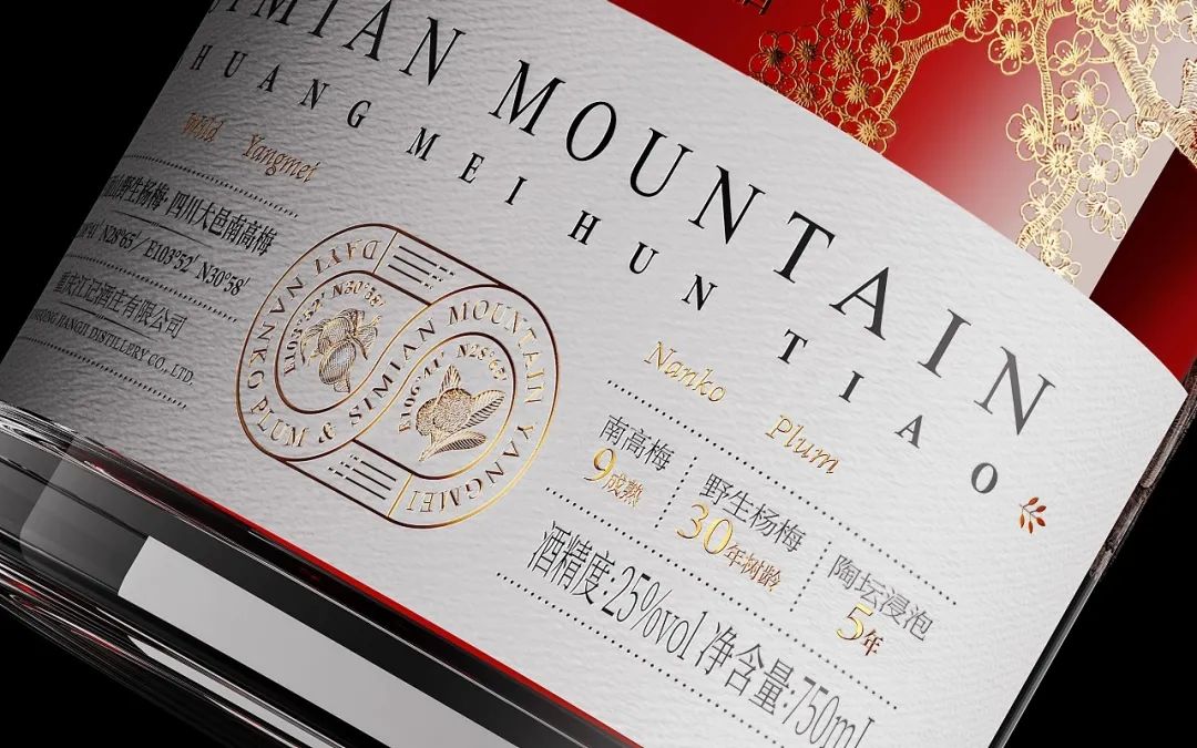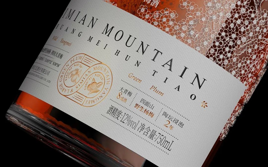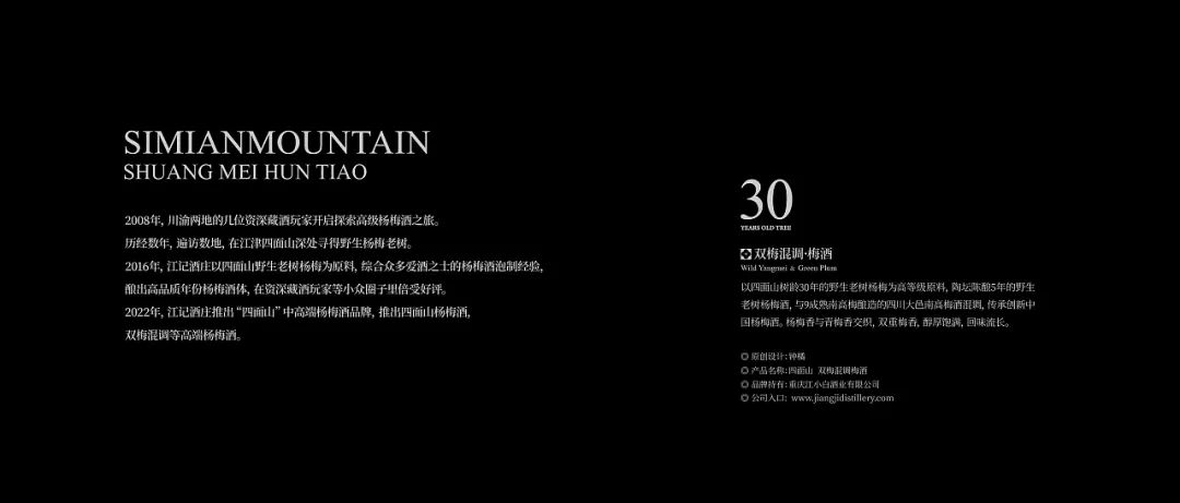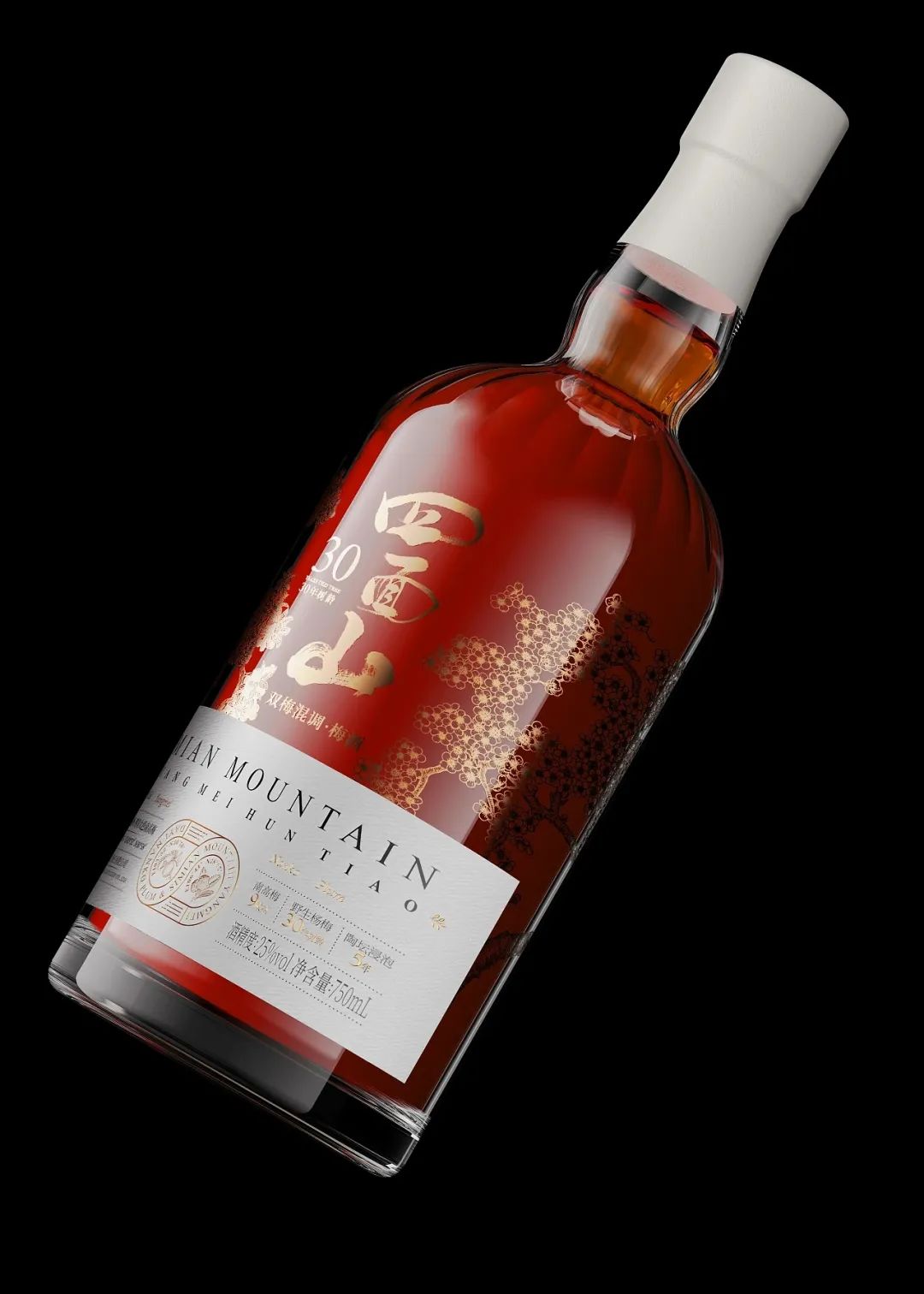 瓶身设计上,将数字30作为视觉重点,采用与“四面山”LOGO一致的烫金工艺打造,一同置于画面中心;底部的酒标也分别采用了9成熟、30年树龄、陶坛浸泡5年的数字表达做产品说明,强化信任背书,彰显“30年树龄”双梅混调的市场价值。