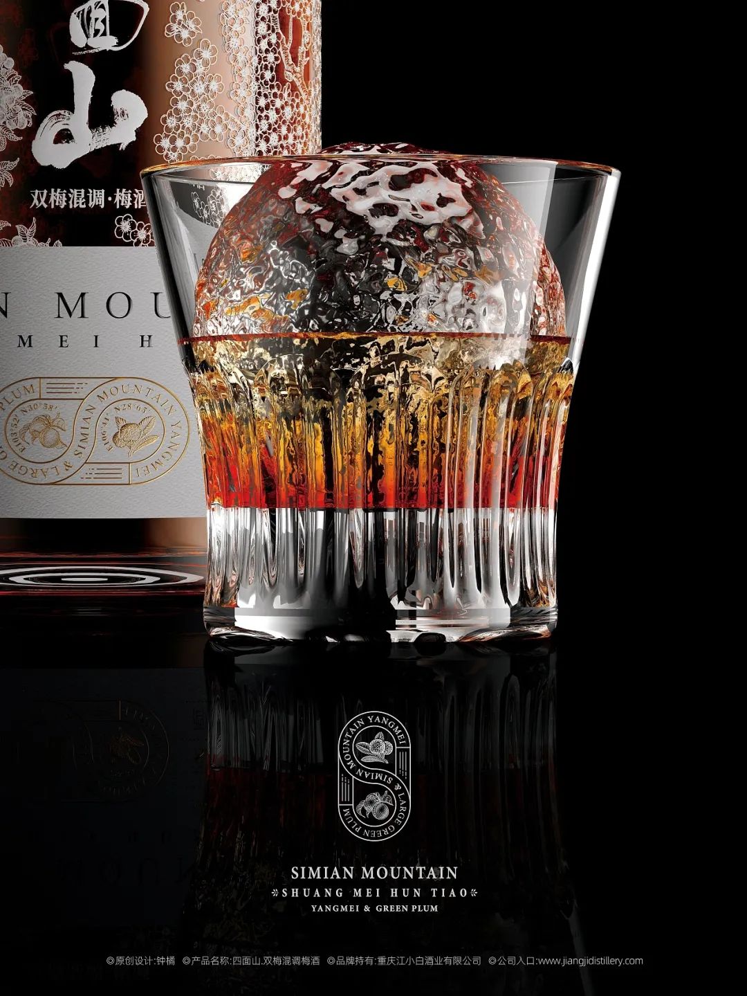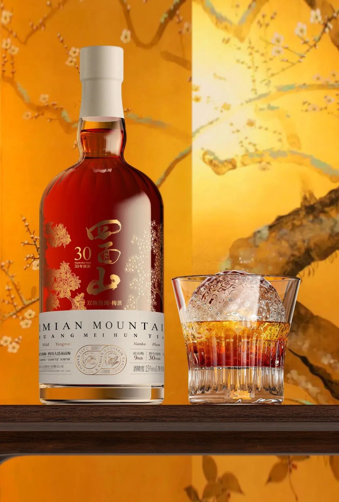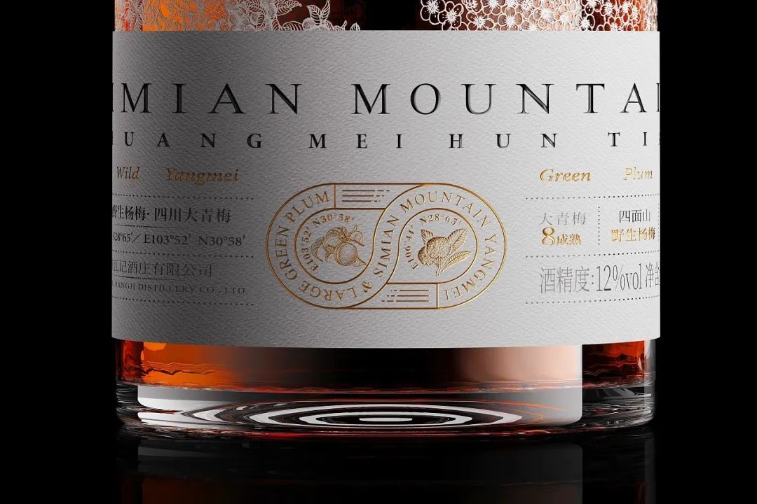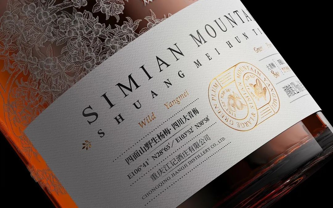 瓶身设计上,将数字30作为视觉重点,采用与“四面山”LOGO一致的烫金工艺打造,一同置于画面中心;底部的酒标也分别采用了9成熟、30年树龄、陶坛浸泡5年的数字表达做产品说明,强化信任背书,彰显“30年树龄”双梅混调的市场价值。