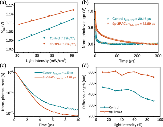 (c) 基于 PTAA 的 PSC 和基于 9p-3PACz 的 PSC 的瞬态光电流曲线。