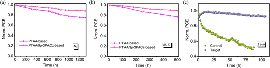 未封装的 PSC 在 (a) N2、(b)热 (85 °C) 和 (c) 1 个太阳光照下的长期稳定性测试。