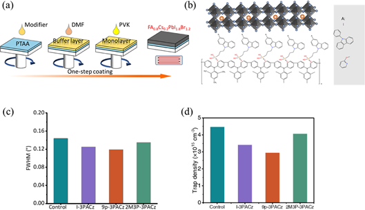 (b) (b-1) 仅 WBG-PVK 的费米能级,(b-2) 与 PTAA 或 PTAA/x-PACz 接触后的费米能级变化,以及 (b-3) WBG-PVK 与 PTAA或 PTAA/x-PACz 接触后的能带弯曲(ΔEF,2)。