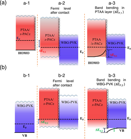 (a) (a-1)PTAA或PTAA/x-PACz的费米能级,(a-2)与WBG-PVK接触后的费米能级变化以及(a-3)PTAA或PTAA/x-PACz 与WBG-PVK 接触后的能带弯曲(ΔEF,1)