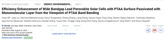 Bi, H.; Liu, J.; Beresneviciute, R.; Tavgeniene, D.; Zhang, Z.; Wang, L.; Kapil, G.; Ding, C.; Sahamir, S. R.; Sanehira, Y.; et al. Efficiency Enhancement of Wide Bandgap Lead Perovskite Solar Cells with PTAA Surface-Passivated with Monomolecular Layer from the Viewpoint of PTAA Band Bending. ACS Appl. Mater. Interfaces 2023. DOI: 10.1021/acsami.3c08655.